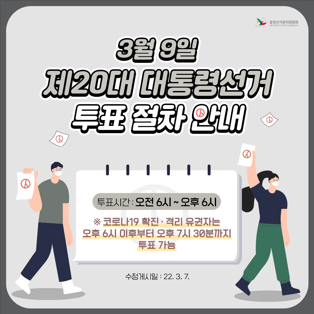 | 3월 9일 제20대 대통령선거 투표 절차 안내 (0) | 2022.03.03 |