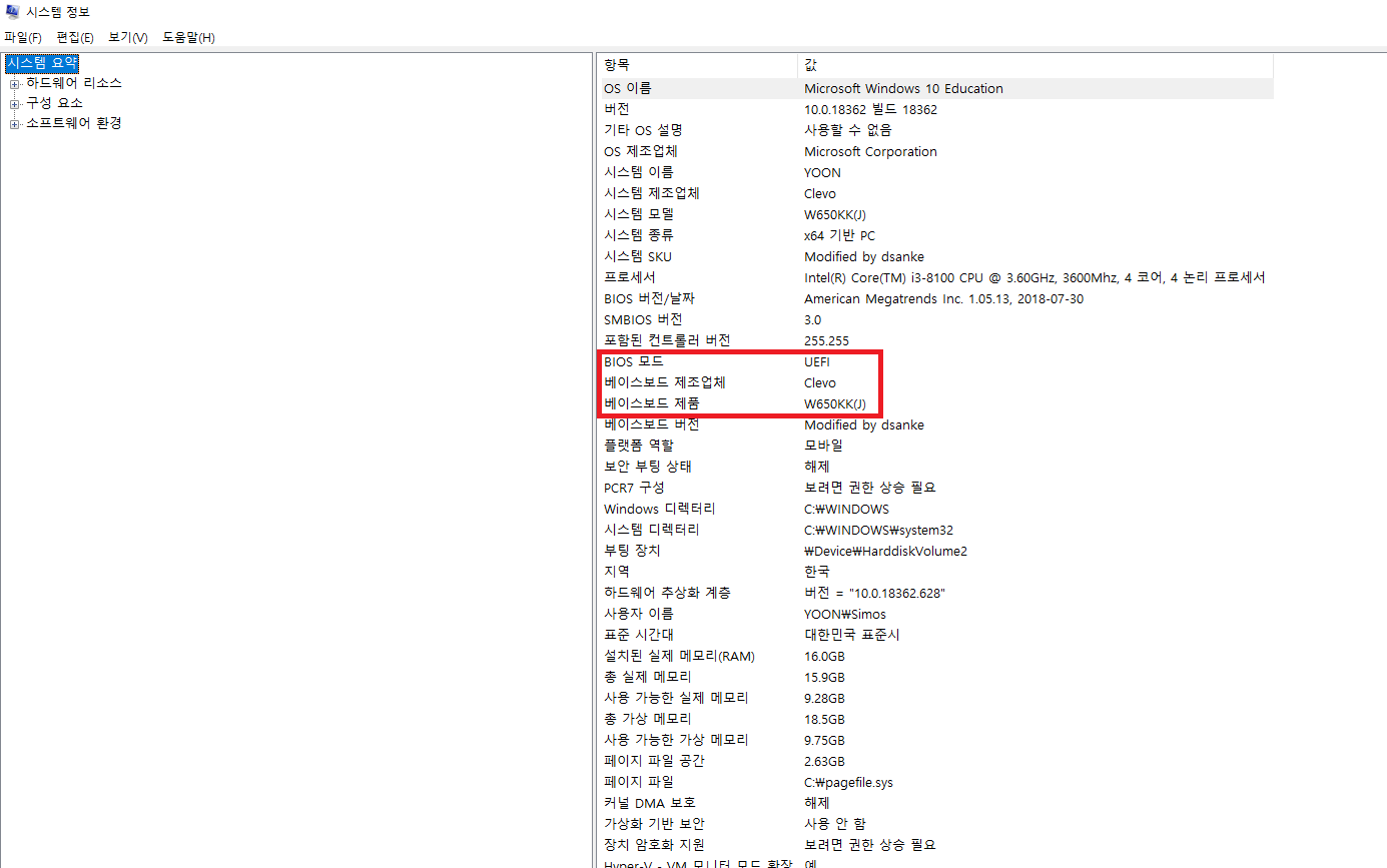 시스템 정보 - 시스템 요약에서 BIOS 모드, 메인보드 제조업체, 제품명 확인이 가능합니다.