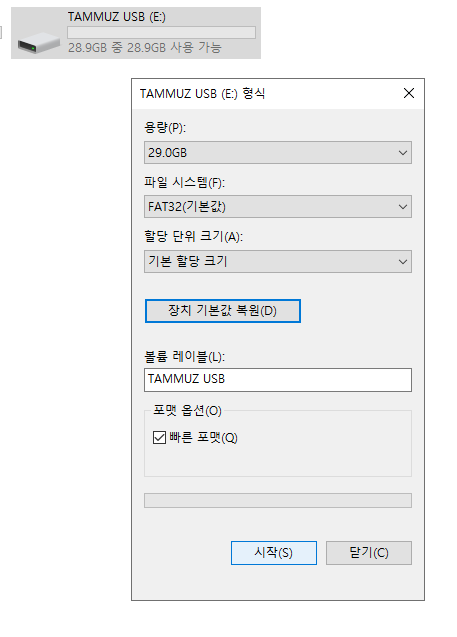 FAT32, 기본 할당 크기, 빠른 포맷 체크 후 시작