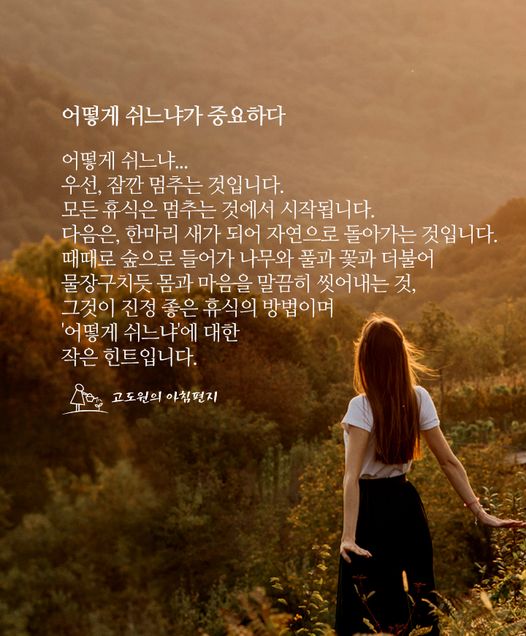 | [고도원의 아침편지💌] 어떻게 쉬느냐가 중요하다 (0) | 2022.07.17 |