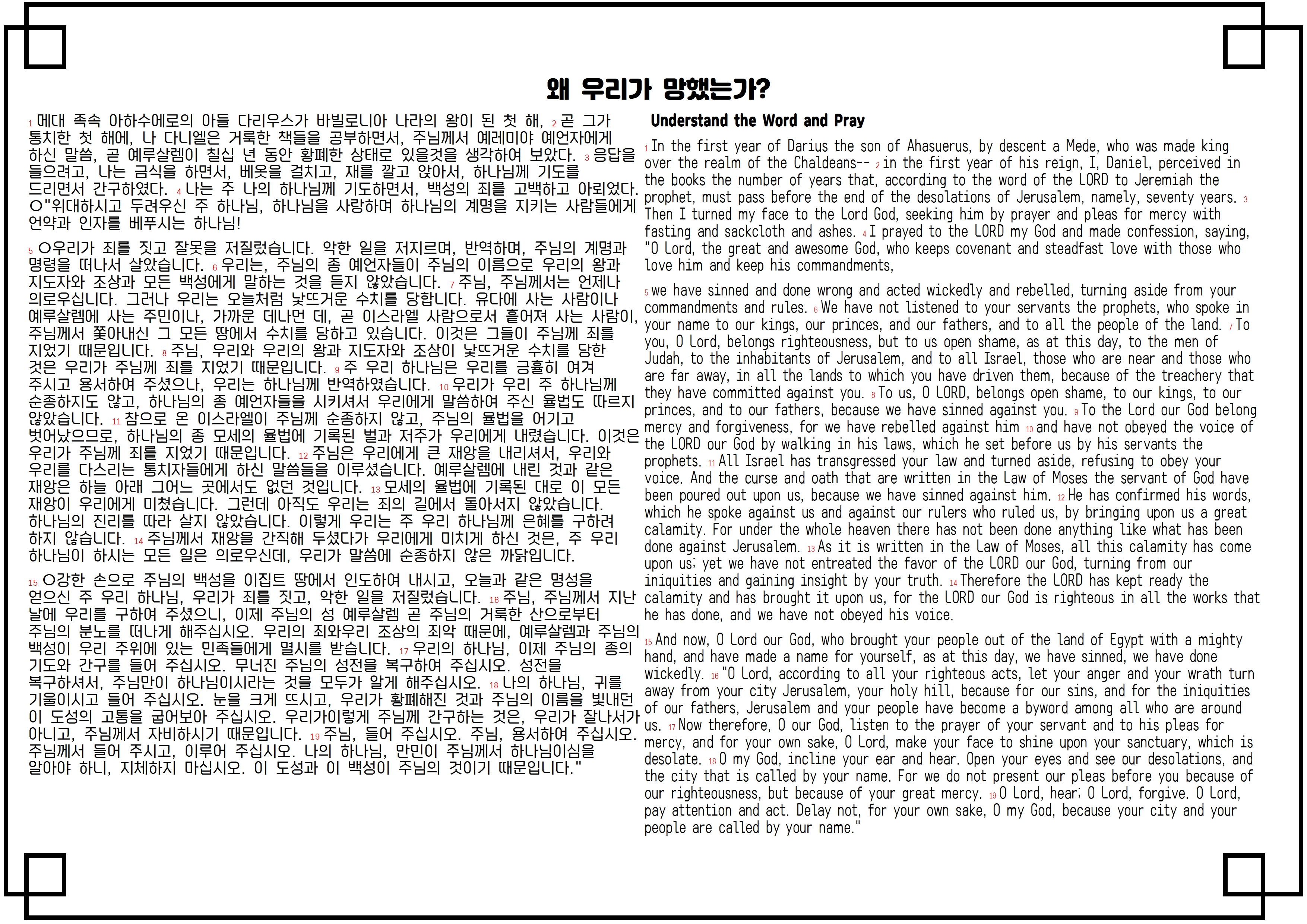 공동체-하나님의 공의를 인정하고 하나님의 주권과 긍휼을 의지하는 다니엘의 기도를 배우게 하소서.