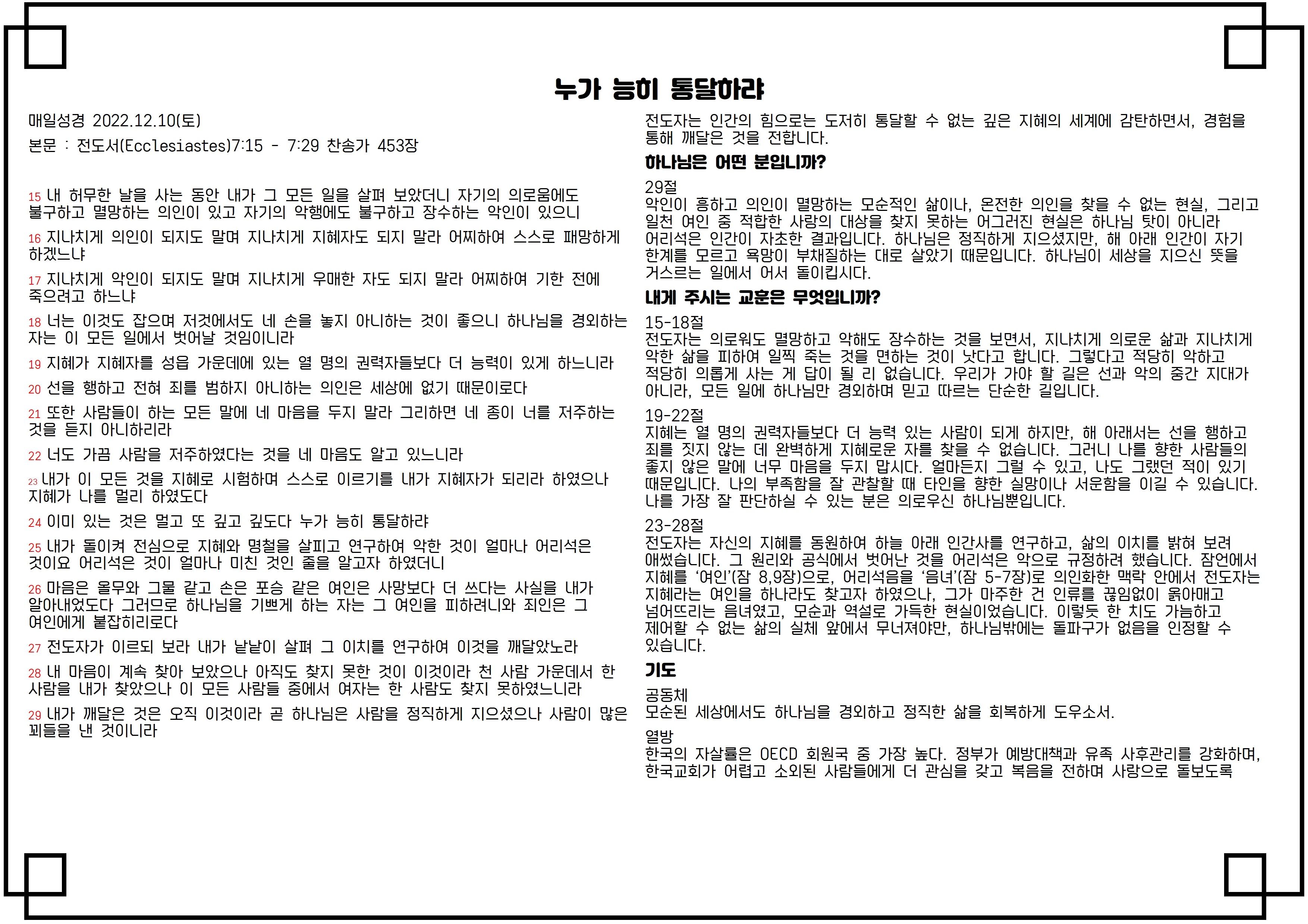본문 : 전도서(Ecclesiastes)7:15 - 7:29 찬송가 453장