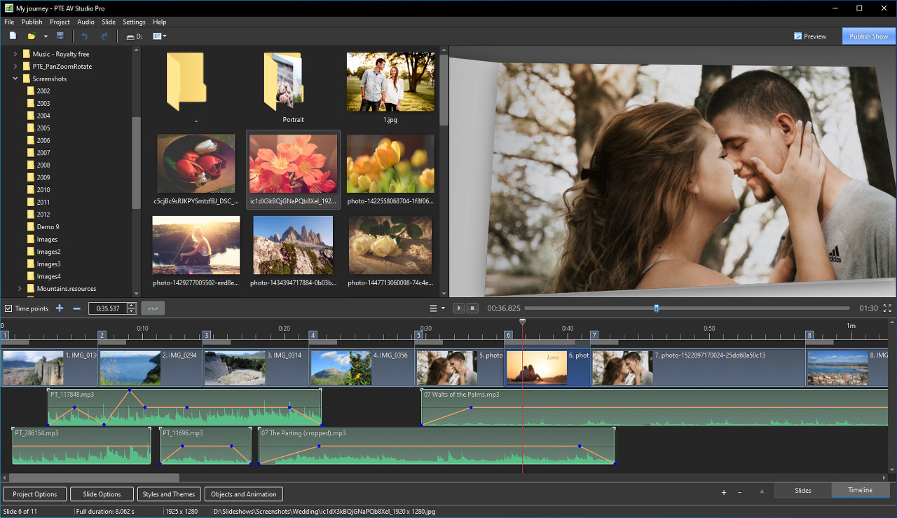 PTE AV Studio Pro에서 전문 사진 슬라이드 쇼를 만듭니다. 사진, 비디오 클립 및 음악을 추가합니다. 키 프레임 애니메이션과 슬라이드 스타일을 사용합니다. 타임라인 보기에서 오디오 클립을 편집합니다. PC, HD 및 4K 비디오, 모바일 장치용 출력입니다.
