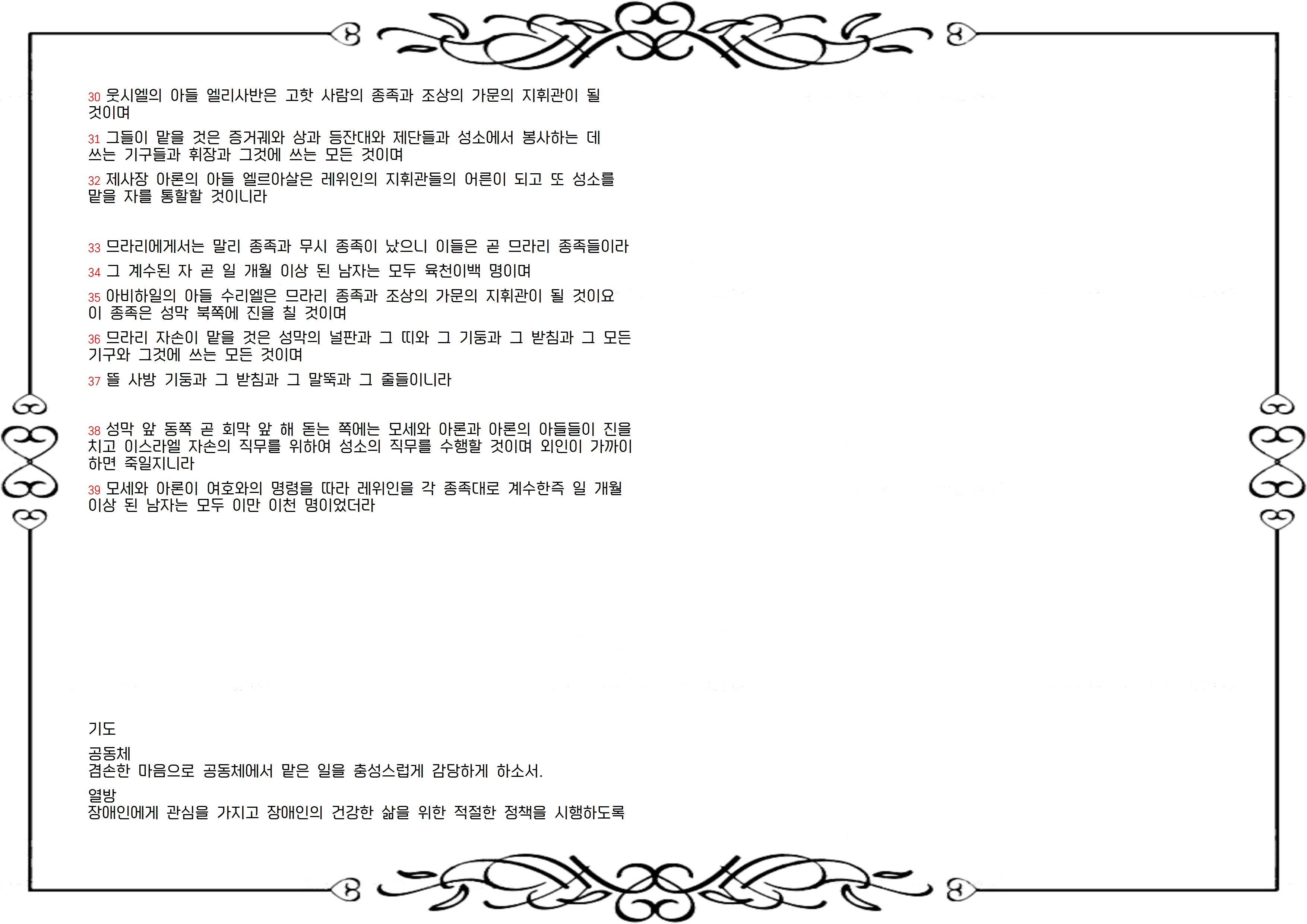 21-37절 사회에서 하는 일에는 열과 성을 다하고 신중을 기하면서, 교회에서 하는 일은 허술하게 하는 경우가 많습니다. 하지만 교회에서 하는 일도 더욱 체계를 갖춰 꼼꼼하게 해야 합니다. 회막에서 봉사하는 레위인의 조직과 업무 분장은 이스라엘의 군대 못지않았습니다. 레위인도 종족별로 진 칠 곳이 따로 정해져 있었고, 직무도 명확하게 구분되어 있었으며, 종족마다 지휘관이 있었을 뿐만 아니라 제사장 엘르아살이 최고 책임자로서 모든 일을 감독했습니다. “하나님은 중심을 보신다”, “형식은 중요하지 않고 본질이 중요하다”는 말을 “교회 일은 대충해도 된다”는 의미로 오용하지는 않습니까? 예배, 전도, 교육, 양육 등 교회에서 하는 모든 일에 정성을 다하고 심혈을 기울입시다.