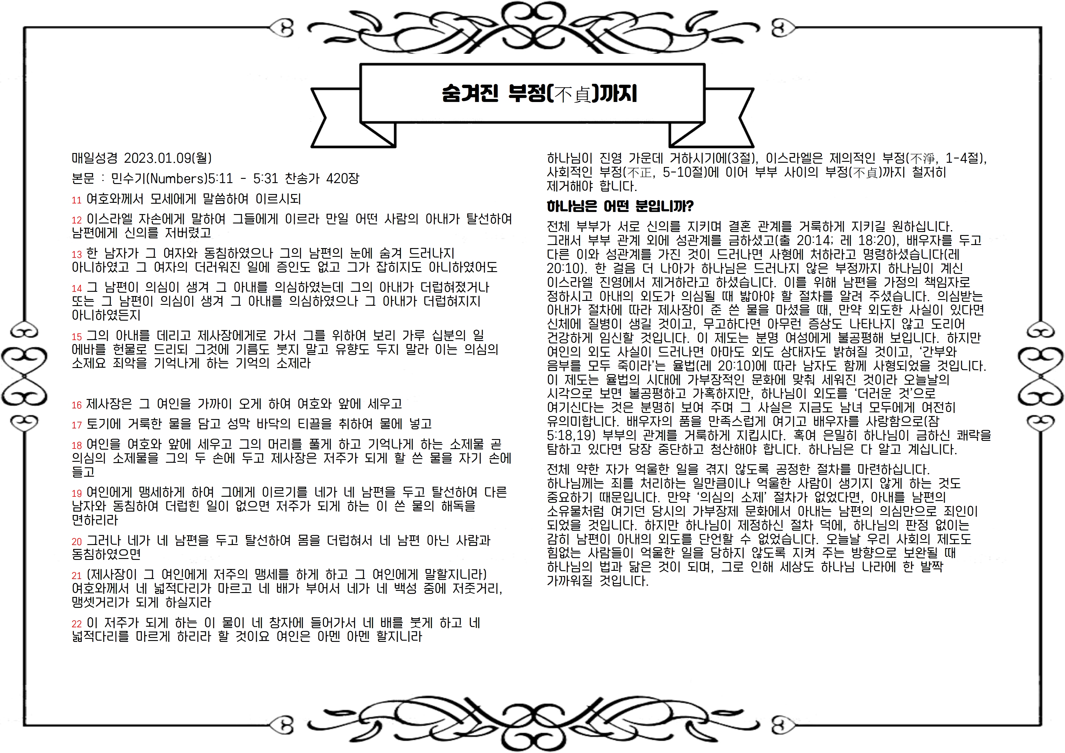 전체 부부가 서로 신의를 지키며 결혼 관계를 거룩하게 지키길 원하십니다. 그래서 부부 관계 외에 성관계를 금하셨고(출 20:14; 레 18:20), 배우자를 두고 다른 이와 성관계를 가진 것이 드러나면 사형에 처하라고 명령하셨습니다(레 20:10). 한 걸음 더 나아가 하나님은 드러나지 않은 부정까지 하나님이 계신 이스라엘 진영에서 제거하라고 하셨습니다. 이를 위해 남편을 가정의 책임자로 정하시고 아내의 외도가 의심될 때 밟아야 할 절차를 알려 주셨습니다. 의심받는 아내가 절차에 따라 제사장이 준 쓴 물을 마셨을 때, 만약 외도한 사실이 있다면 신체에 질병이 생길 것이고, 무고하다면 아무런 증상도 나타나지 않고 도리어 건강하게 임신할 것입니다. 이 제도는 분명 여성에게 불공평해 보입니다. 하지만 여인의 외도 사실이 드러나면 아마도 외도 상대자도 밝혀질 것이고, ‘간부와 음부를 모두 죽이라’는 율법(레 20:10)에 따라 남자도 함께 사형되었을 것입니다. 이 제도는 율법의 시대에 가부장적인 문화에 맞춰 세워진 것이라 오늘날의 시각으로 보면 불공평하고 가혹하지만, 하나님이 외도를 ‘더러운 것’으로 여기신다는 것은 분명히 보여 주며 그 사실은 지금도 남녀 모두에게 여전히 유의미합니다. 배우자의 품을 만족스럽게 여기고 배우자를 사랑함으로(잠 5:18,19) 부부의 관계를 거룩하게 지킵시다. 혹여 은밀히 하나님이 금하신 쾌락을 탐하고 있다면 당장 중단하고 청산해야 합니다. 하나님은 다 알고 계십니다.
