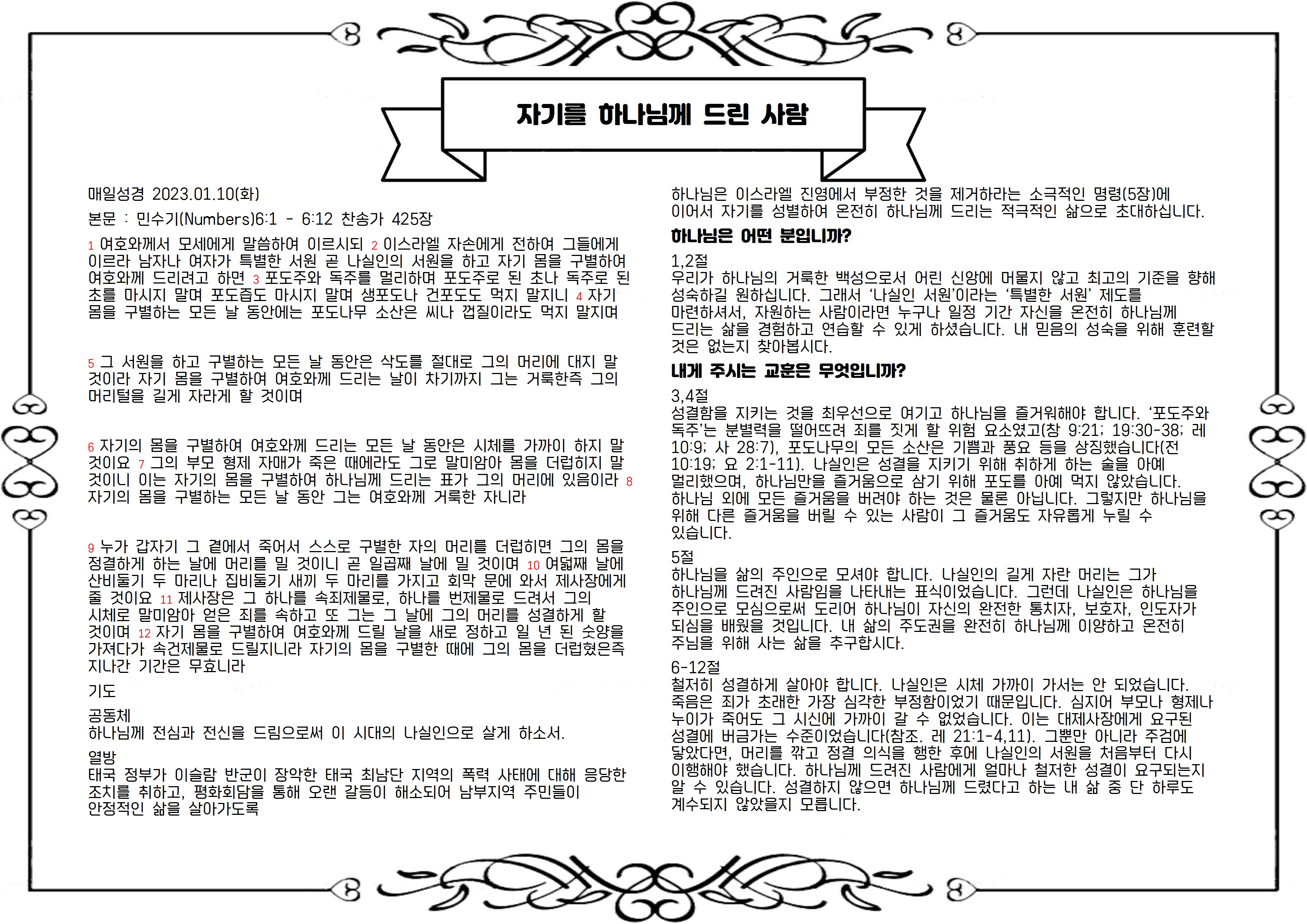 하나님은 이스라엘 진영에서 부정한 것을 제거하라는 소극적인 명령(5장)에 이어서 자기를 성별하여 온전히 하나님께 드리는 적극적인 삶으로 초대하십니다.