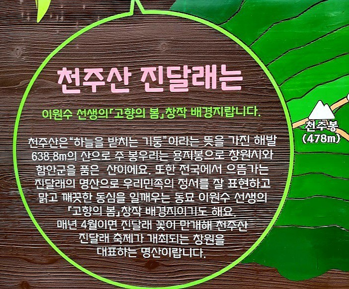 창원은 바닷가지만 100대 명산인 무학산이 있고 청량산 봉화산 광려산 천주산 백월산 작태산 천마산 마금산 태복산 정병산 비음산 대암산 불모산 장복산 웅산 등등 20개가 넘는데 봄철에 불타는 진달래 명산이 2군데나 있습니다 천주산과 무학산인데 어제 천주산 진달래를 보고 왔지요 조만간 무학산도 가볼까 합니다.