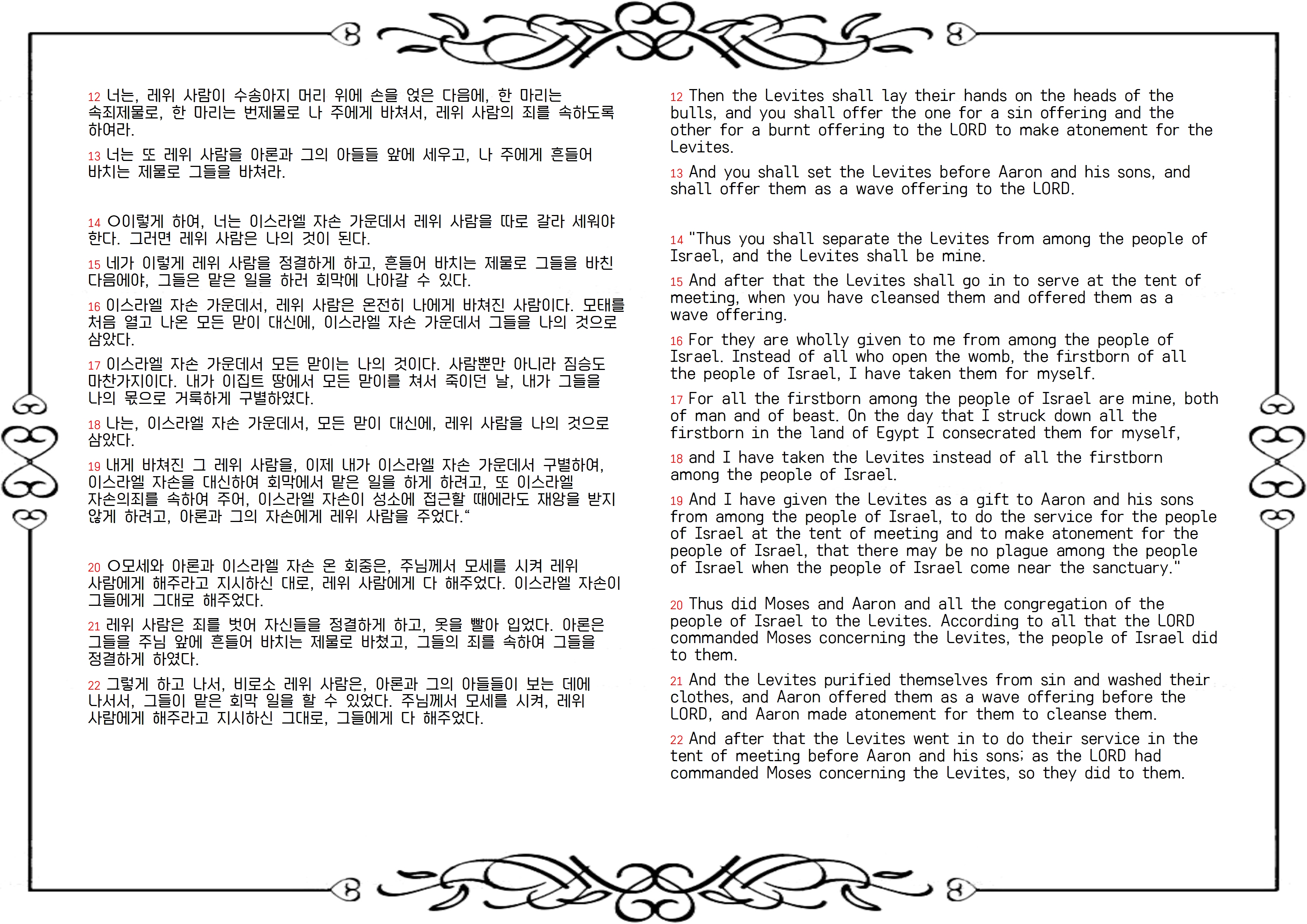 5-13절 하나님께 드려진 사람, 하나님께 나아가는 자는 정결해야 합니다. 레위인 봉헌 의식의 핵심은 정결과 속죄였습니다. 몸에 물을 뿌리고 몸의 털을 밀고 의복을 빨아서 자기 몸을 정결하게 해야 했으며, 번제물과 속죄제물을 드려 속죄해야 했습니다. 그리스도의 피로 속죄함을 받은 사람만이 거룩하신 하나님의 소유가 될 수 있으며, 하나님께 드려진 사람은 죄와 불의에서 떠나 자신을 정결하게 유지해야 해야 합니다. 예수님이 깨끗하게 하신 내 몸과 마음을 매일 깨끗하게 지켜 냅시다.