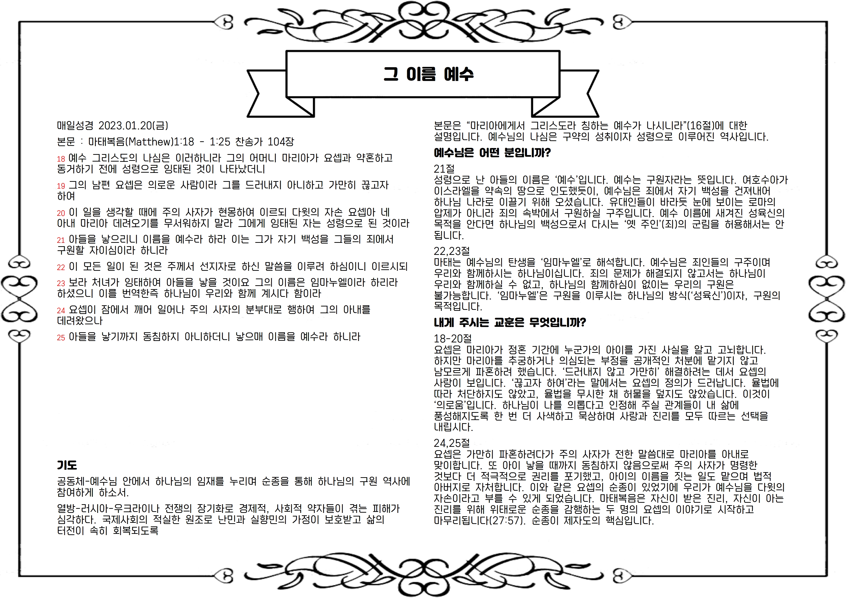 21절 성령으로 난 아들의 이름은 ‘예수’입니다. 예수는 구원자라는 뜻입니다. 여호수아가 이스라엘을 약속의 땅으로 인도했듯이, 예수님은 죄에서 자기 백성을 건져내어 하나님 나라로 이끌기 위해 오셨습니다. 유대인들이 바라듯 눈에 보이는 로마의 압제가 아니라 죄의 속박에서 구원하실 구주입니다. 예수 이름에 새겨진 성육신의 목적을 안다면 하나님의 백성으로서 다시는 ‘옛 주인’(죄)의 군림을 허용해서는 안 됩니다.