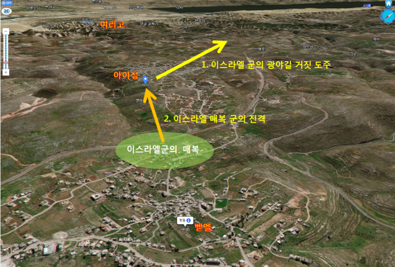 아이성을 3D 지도를 통하여 보면 아이성은 사면이 트여있고, 주위에서 가장 높은 곳으로 벧엘과 감람산, 여리고성까지 잘 볼 수 있으며 매우 거대한 성이었으며 3D 지도를 통하여 내려다 보면 요새위치로써 얼마나 좋은 전략적 위치인지를 확인할 수 있다
