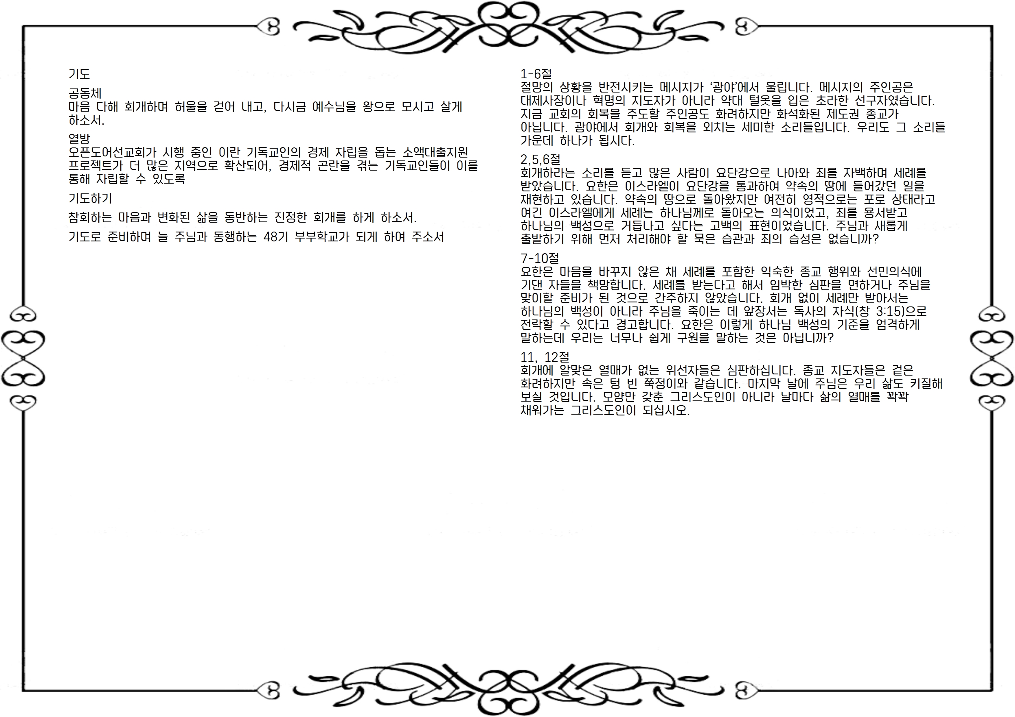 1-6절 절망의 상황을 반전시키는 메시지가 ‘광야’에서 울립니다. 메시지의 주인공은 대제사장이나 혁명의 지도자가 아니라 약대 털옷을 입은 초라한 선구자였습니다. 지금 교회의 회복을 주도할 주인공도 화려하지만 화석화된 제도권 종교가 아닙니다. 광야에서 회개와 회복을 외치는 세미한 소리들입니다. 우리도 그 소리들 가운데 하나가 됩시다.