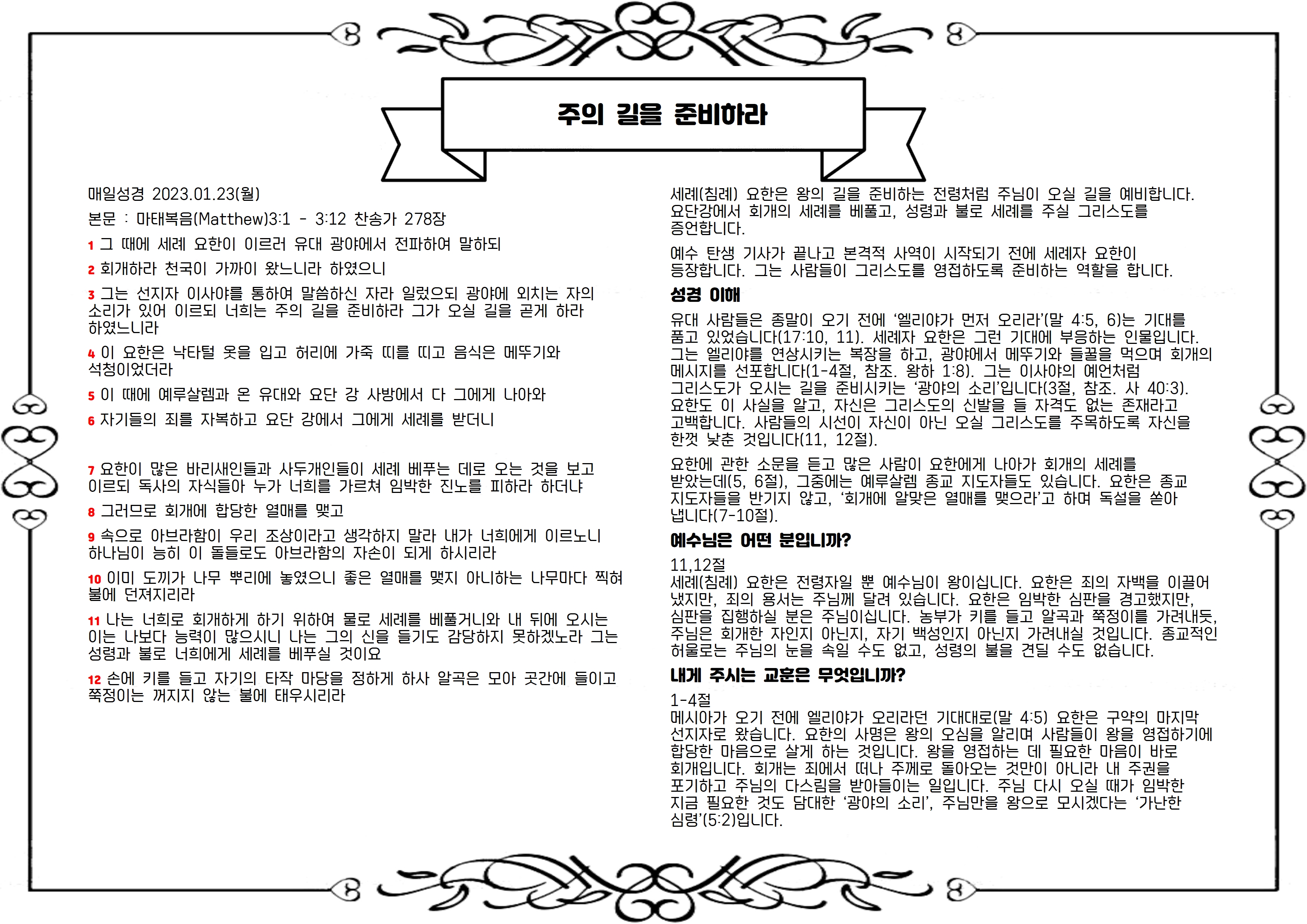 본문 : 마태복음(Matthew)3:1 - 3:12 찬송가 278장