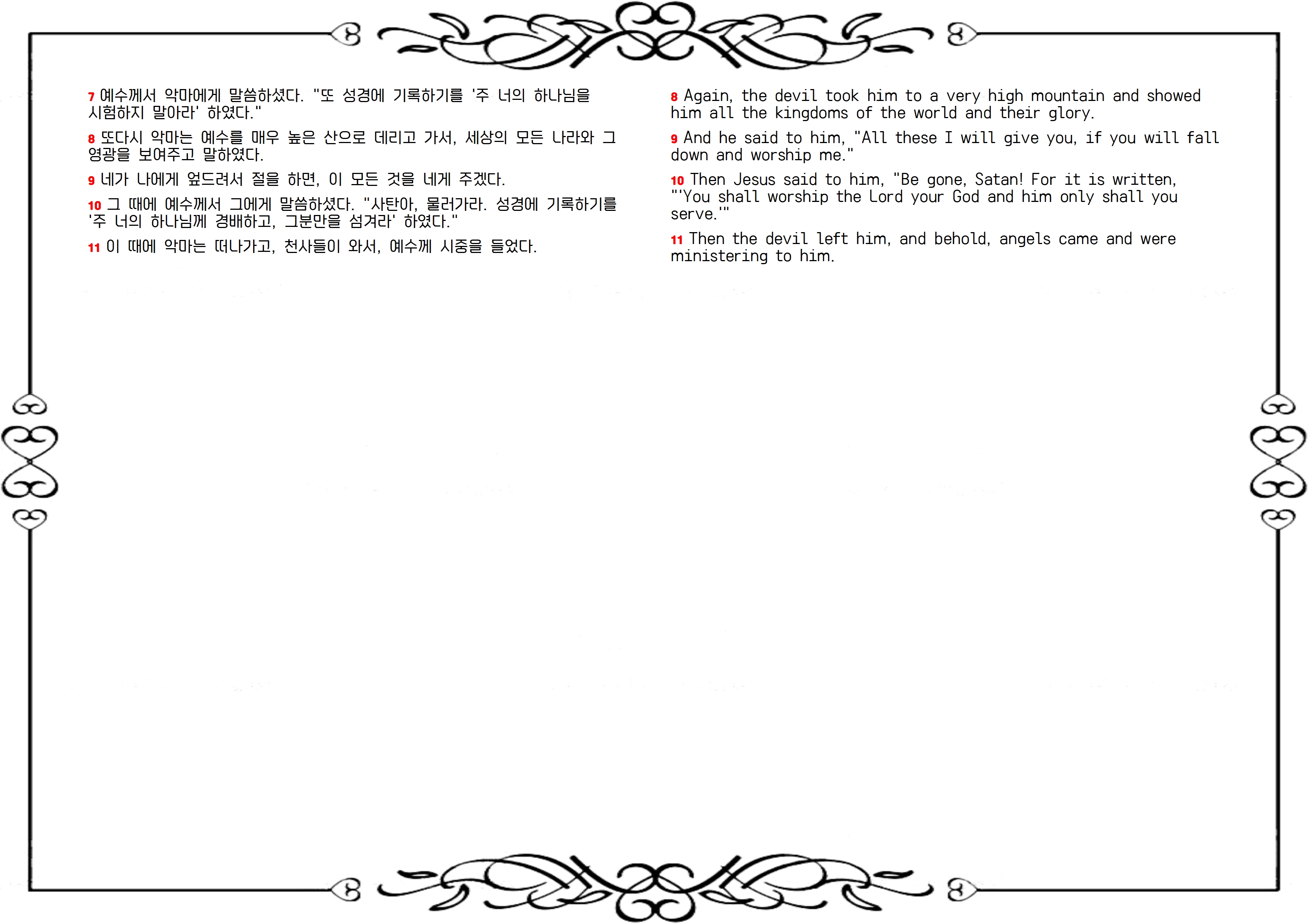 4:1-11 악마가 기록된 말씀을 거론하며 유혹하지만, 예수님도 기록된 말씀(신 8:5; 6:14, 16)으로 물리치십니다. 우리도 예수님과 같은 시험에 직면합니다. 악마는 십자가를 지는 어려운 길 말고, 돈과 명예와 권력을 얻을 수 있는 쉬운 길을 택하라고 부추깁니다. 말씀까지 덧붙이면 그야말로 달콤한 유혹입니다. 시험에 넘어지지 않으려면 예수님처럼 견고한 말씀으로 무장하십시오.
