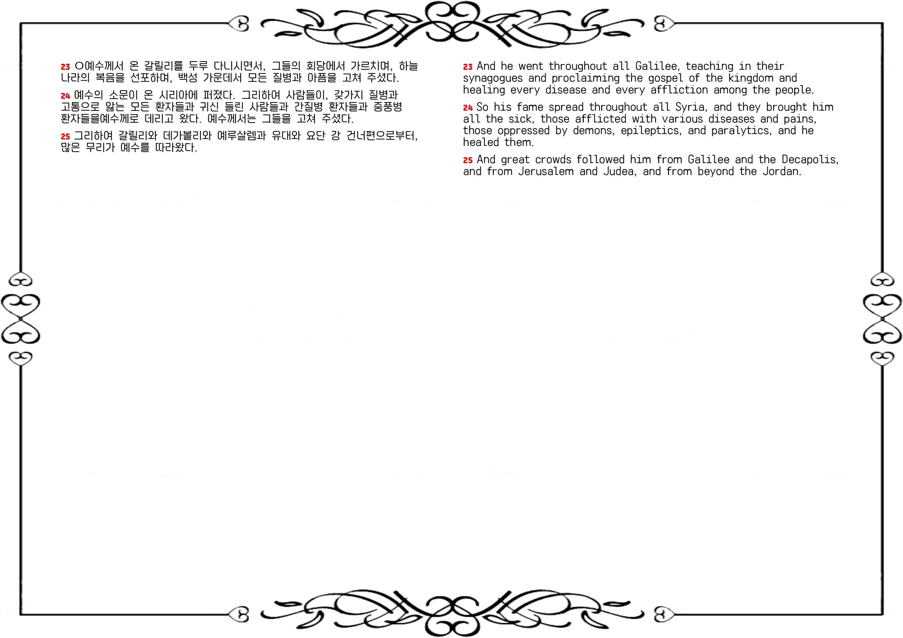예수님은 갈릴리 지역을 두루 다니며 천국 복음을 전파하시고, 병자들을 고치십니다. 각종 병과 약한 것을 고치심으로 천국이 이미 그들 가운데 임했음을 증명하신 것입니다(23, 24절). 예수님의 소문은 온 시리아에 퍼졌고, 갈릴리뿐 아니라 데가볼리와 예루살렘과 온 유대, 그리고 요단강 동편의 이방 지역으로부터 많은 무리가 몰려들었습니다(25절).