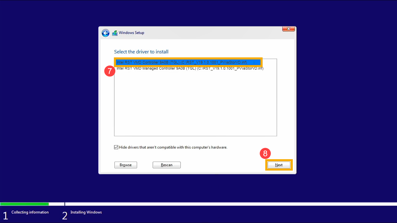 - [Intel RST VMD Controller 9A08 (TGL)]⑦을 선택하고 [다음]⑧을 선택하여 드라이버를 설치합니다.