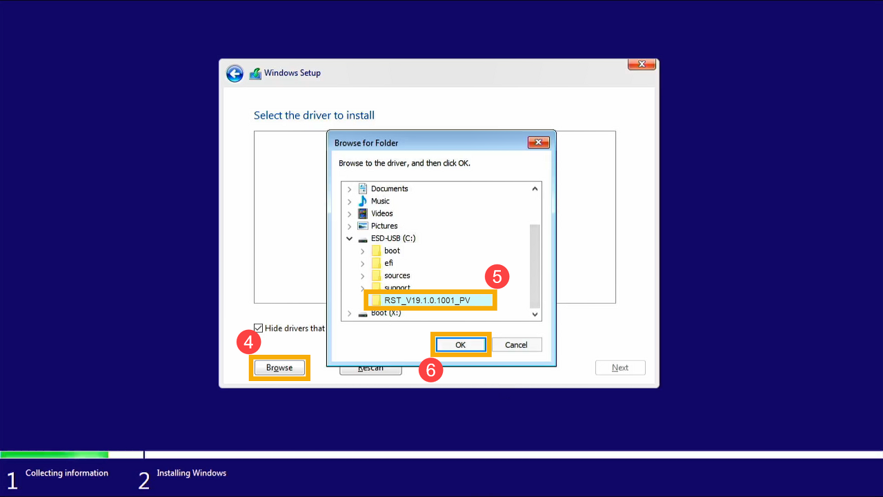 - [찾아보기]④를 선택한 후 [RST_V19.1.0.1001_PV] 폴더⑤를 찾아 [확인]⑥을 선택합니다.