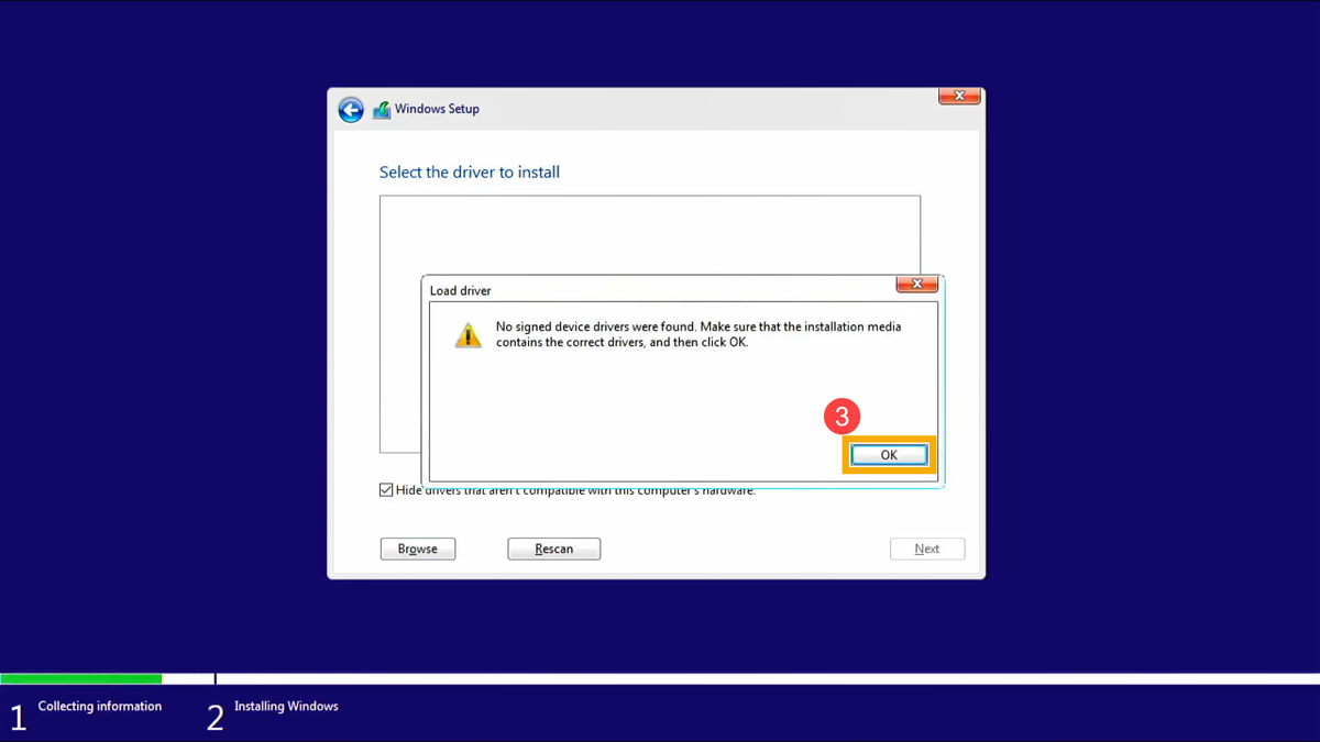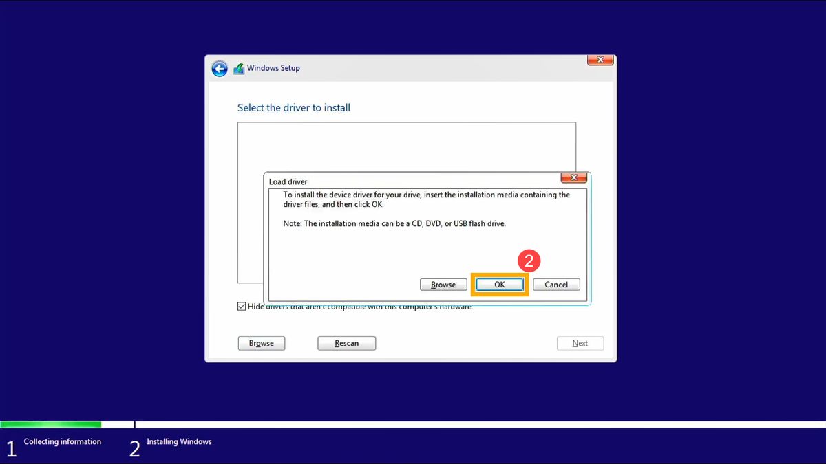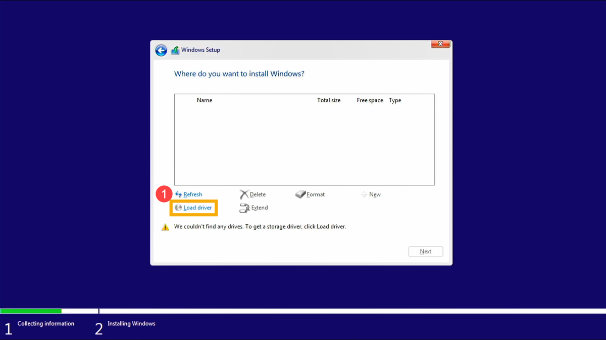 - Windows 설치 위치를 묻는 메시지와 Windows에서 드라이브를 찾을 수 없다는 메시지가 화면에 표시되면 [드라이버 로드]①를 선택합니다.
