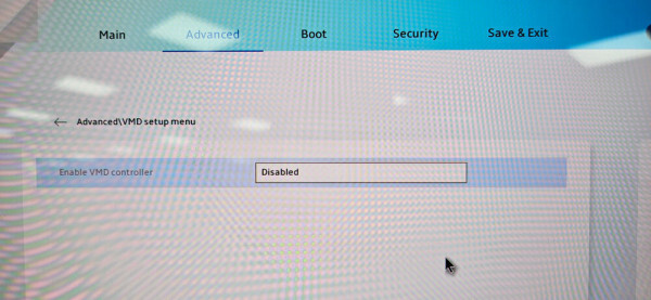 해당 경우 바이오스에서 VMD controller 부분을 비활성화(Disabled)로 변경해 주시고