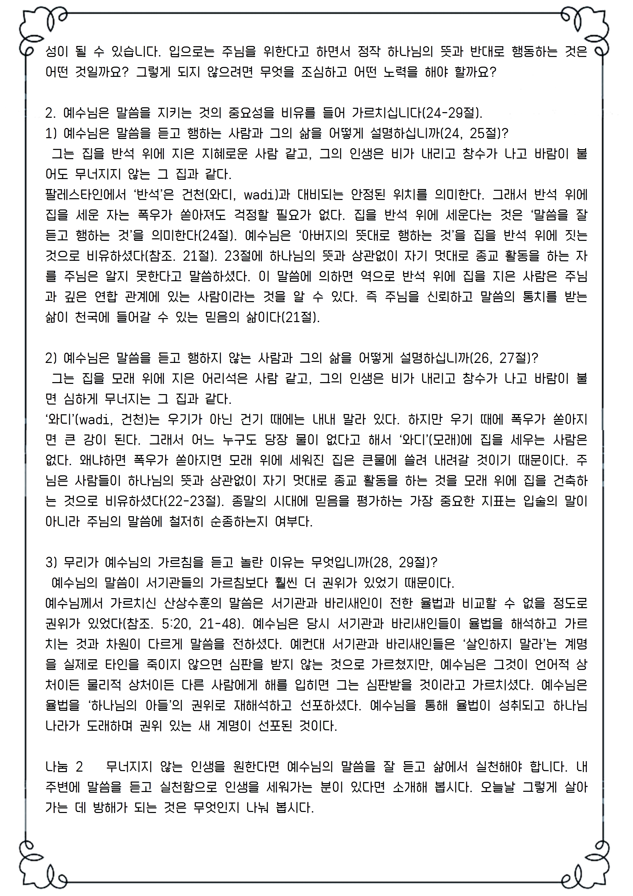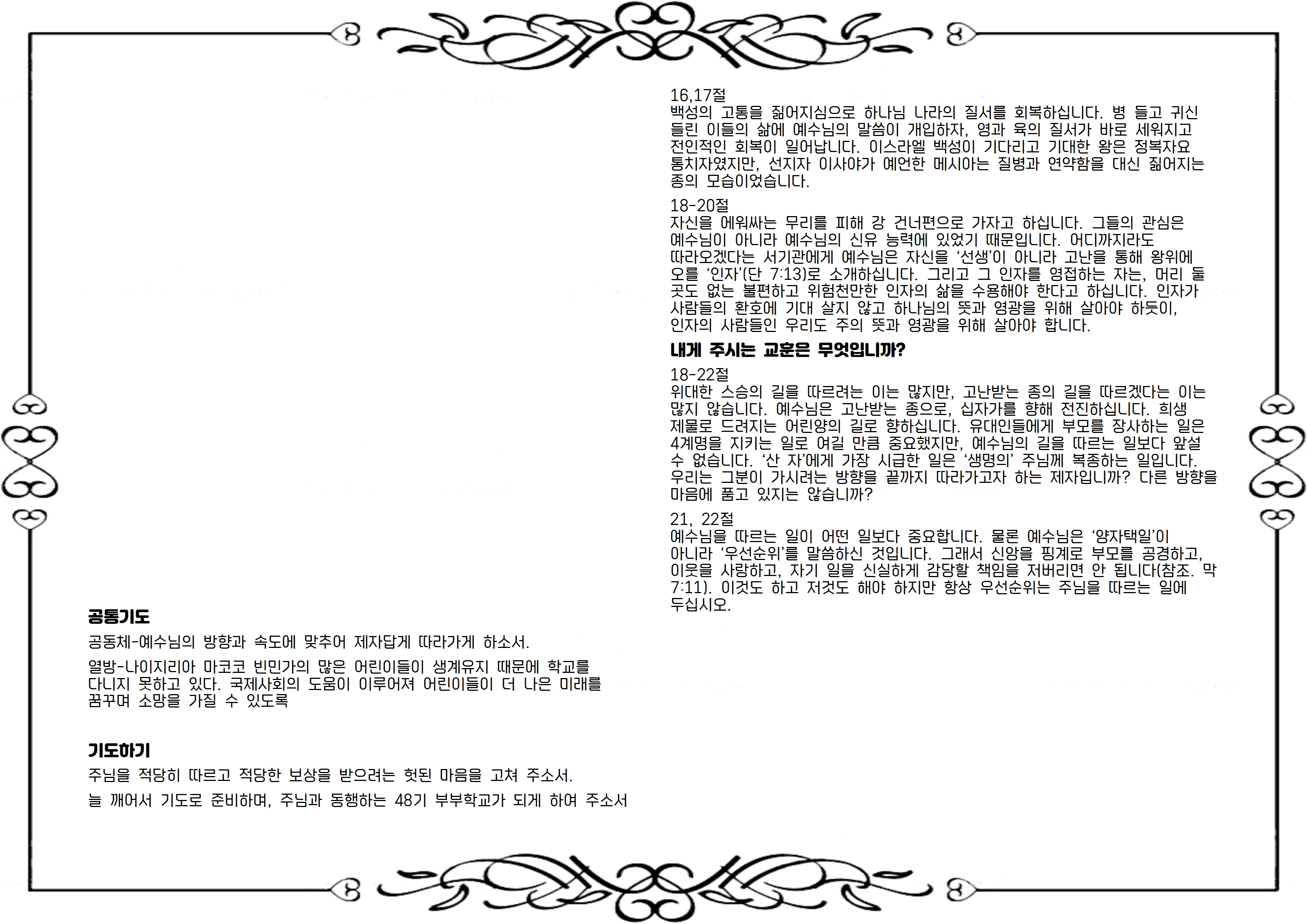 18-22절 위대한 스승의 길을 따르려는 이는 많지만, 고난받는 종의 길을 따르겠다는 이는 많지 않습니다. 예수님은 고난받는 종으로, 십자가를 향해 전진하십니다. 희생 제물로 드려지는 어린양의 길로 향하십니다. 유대인들에게 부모를 장사하는 일은 4계명을 지키는 일로 여길 만큼 중요했지만, 예수님의 길을 따르는 일보다 앞설 수 없습니다. ‘산 자’에게 가장 시급한 일은 ‘생명의’ 주님께 복종하는 일입니다. 우리는 그분이 가시려는 방향을 끝까지 따라가고자 하는 제자입니까? 다른 방향을 마음에 품고 있지는 않습니까?