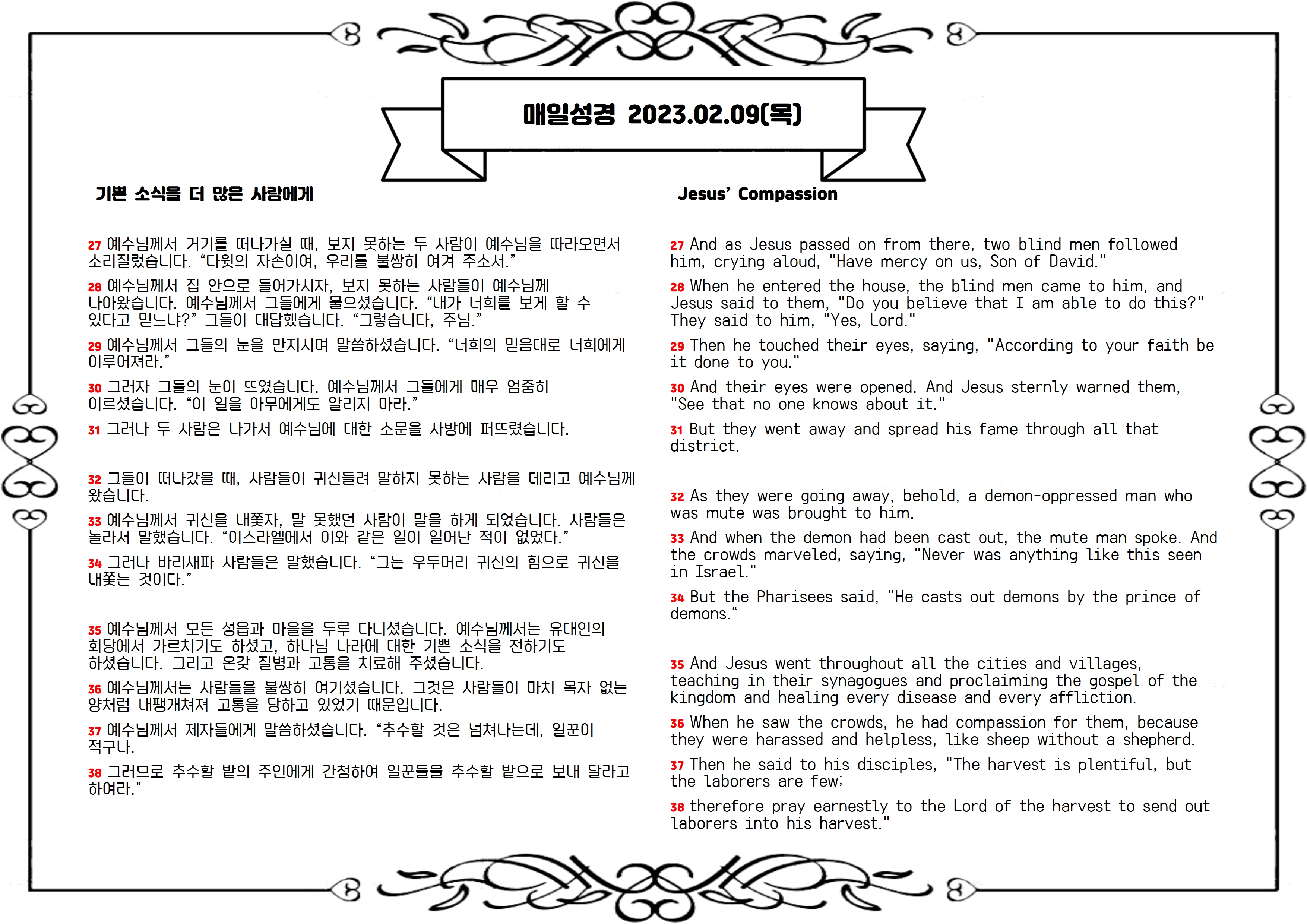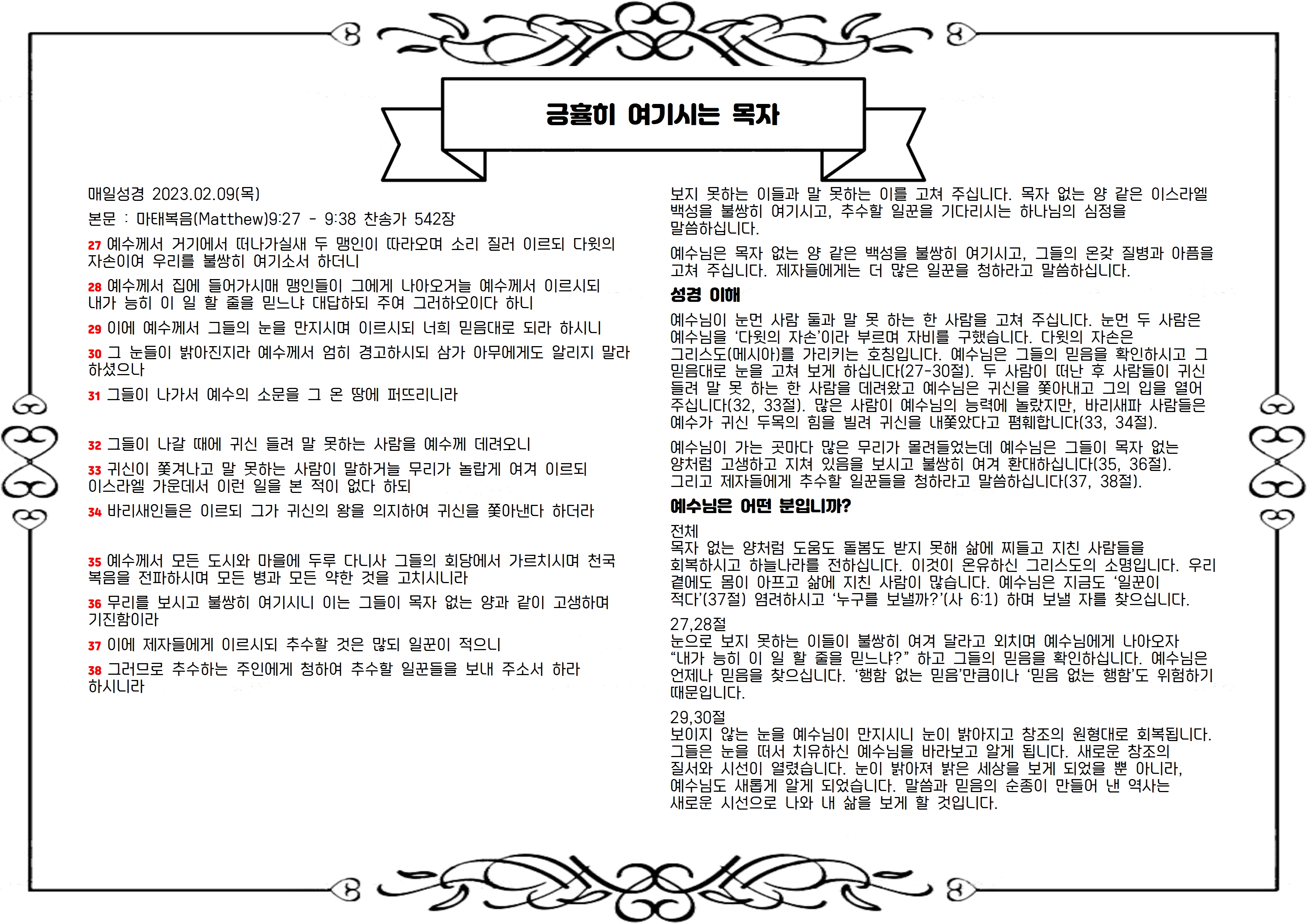 예수님이 눈먼 사람 둘과 말 못 하는 한 사람을 고쳐 주십니다. 눈먼 두 사람은 예수님을 ‘다윗의 자손’이라 부르며 자비를 구했습니다. 다윗의 자손은 그리스도(메시아)를 가리키는 호칭입니다. 예수님은 그들의 믿음을 확인하시고 그 믿음대로 눈을 고쳐 보게 하십니다(27-30절). 두 사람이 떠난 후 사람들이 귀신 들려 말 못 하는 한 사람을 데려왔고 예수님은 귀신을 쫓아내고 그의 입을 열어 주십니다(32, 33절). 많은 사람이 예수님의 능력에 놀랐지만, 바리새파 사람들은 예수가 귀신 두목의 힘을 빌려 귀신을 내쫓았다고 폄훼합니다(33, 34절).