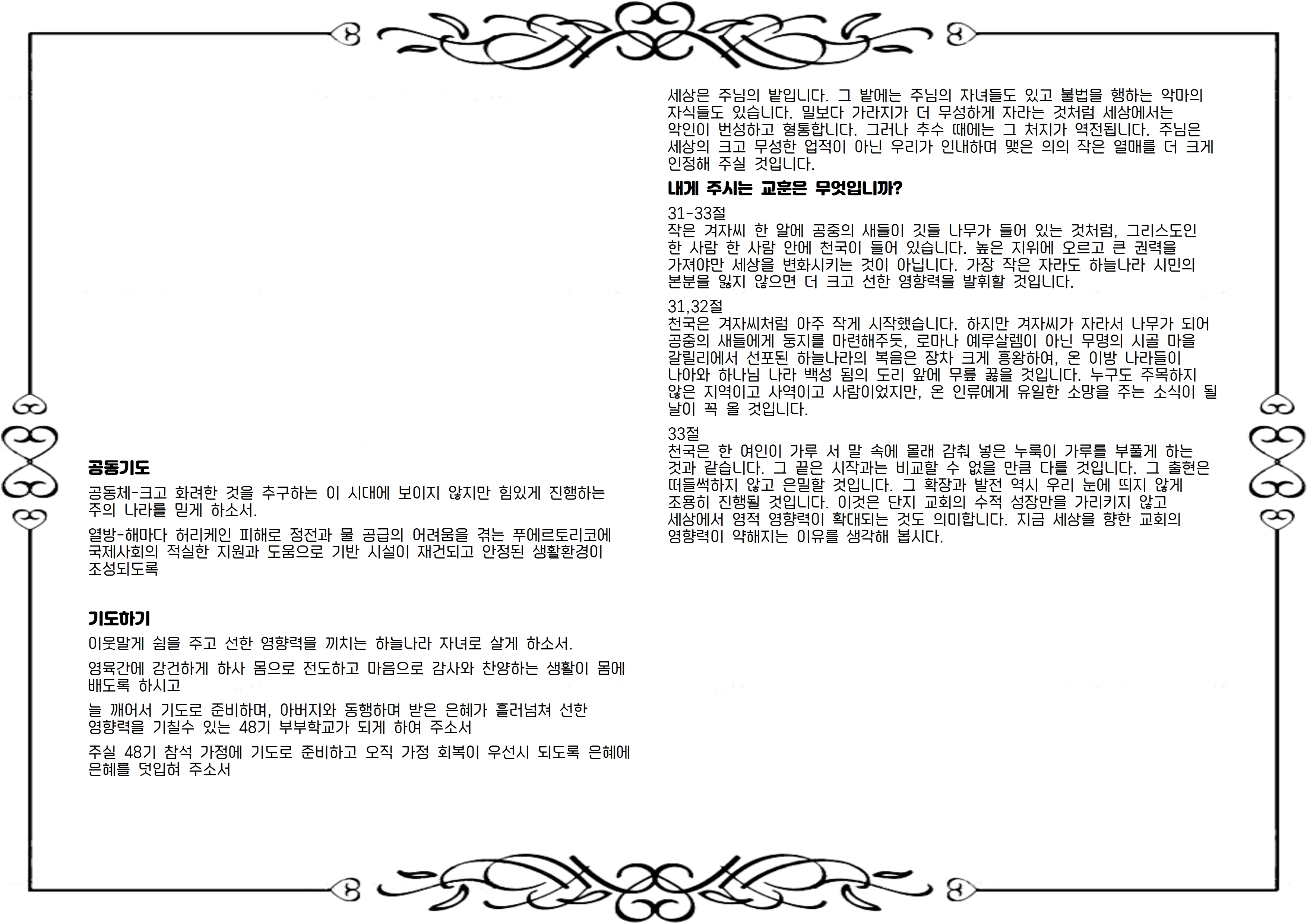 31-33절 작은 겨자씨 한 알에 공중의 새들이 깃들 나무가 들어 있는 것처럼, 그리스도인 한 사람 한 사람 안에 천국이 들어 있습니다. 높은 지위에 오르고 큰 권력을 가져야만 세상을 변화시키는 것이 아닙니다. 가장 작은 자라도 하늘나라 시민의 본분을 잃지 않으면 더 크고 선한 영향력을 발휘할 것입니다.