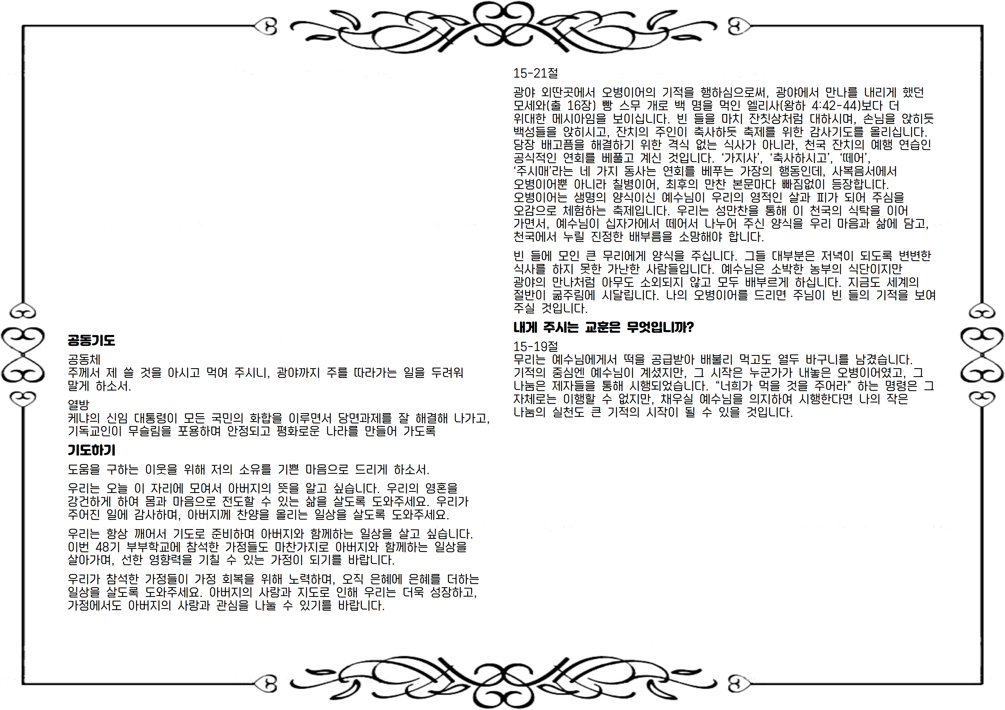무리는 예수님에게서 떡을 공급받아 배불리 먹고도 열두 바구니를 남겼습니다. 기적의 중심엔 예수님이 계셨지만, 그 시작은 누군가가 내놓은 오병이어였고, 그 나눔은 제자들을 통해 시행되었습니다. “너희가 먹을 것을 주어라” 하는 명령은 그 자체로는 이행할 수 없지만, 채우실 예수님을 의지하여 시행한다면 나의 작은 나눔의 실천도 큰 기적의 시작이 될 수 있을 것입니다.