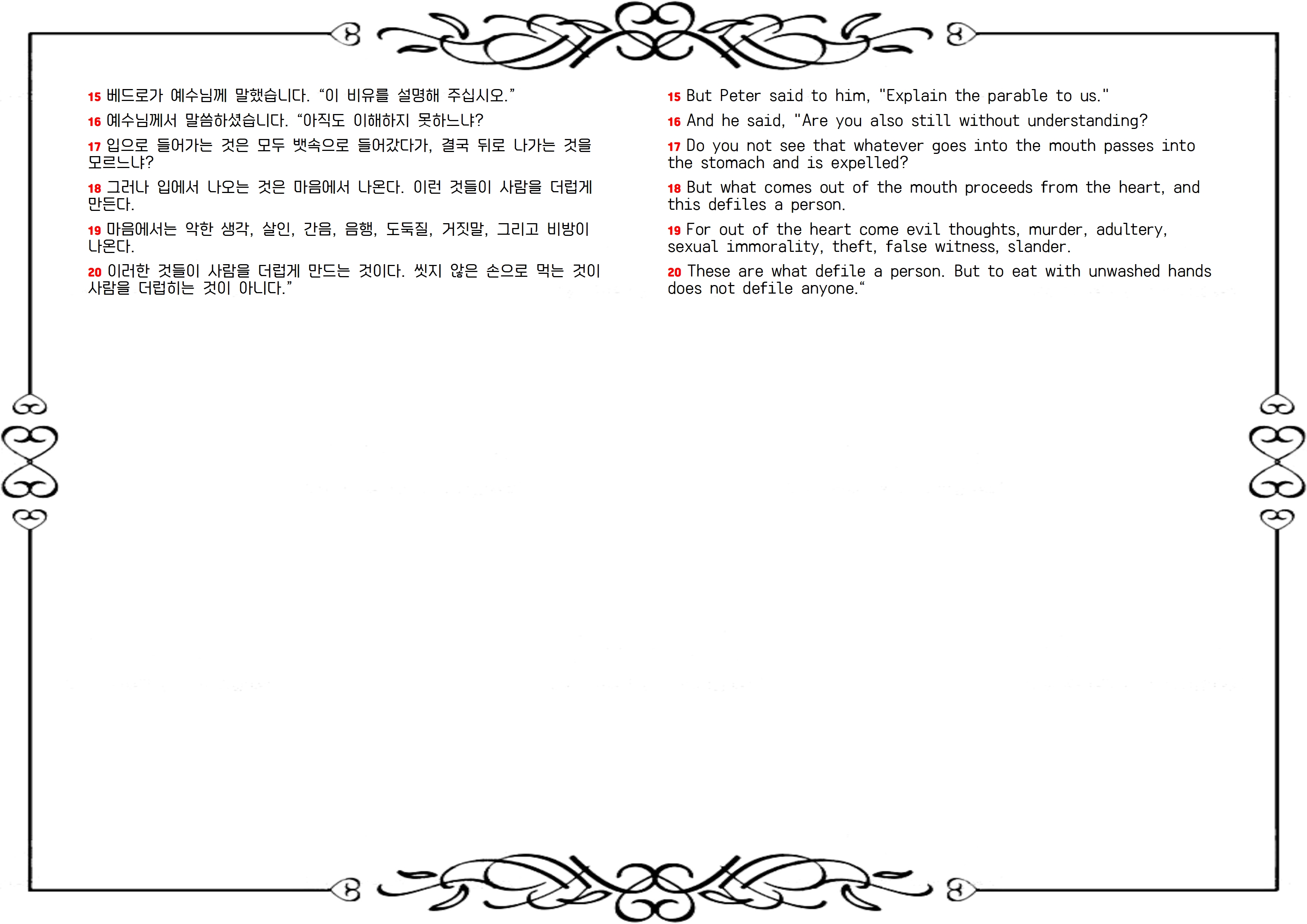 예수님은 종교지도자들의 말과 가르침과 예배를 모두 위선으로 규정하십니다. 그들의 마음이 하나님을 멀리 떠나 있었기 때문입니다(7-11절). 예수님은 그들을 하나님이 심지 않은 나무, 눈먼 길잡이라 하시고 그들에게 하나님의 심판을 선언하십니다(12-14절). 종교지도자들은 손을 씻지 않은 제자들을 문제 삼았지만, 예수님은 마음에 온갖 더러운 것을 담고 있는 종교지도자들을 정죄하십니다. 입으로 들어가는 것이 아니라, 마음에서 입으로 나오는 것이 사람을 더럽힙니다(15-20절).