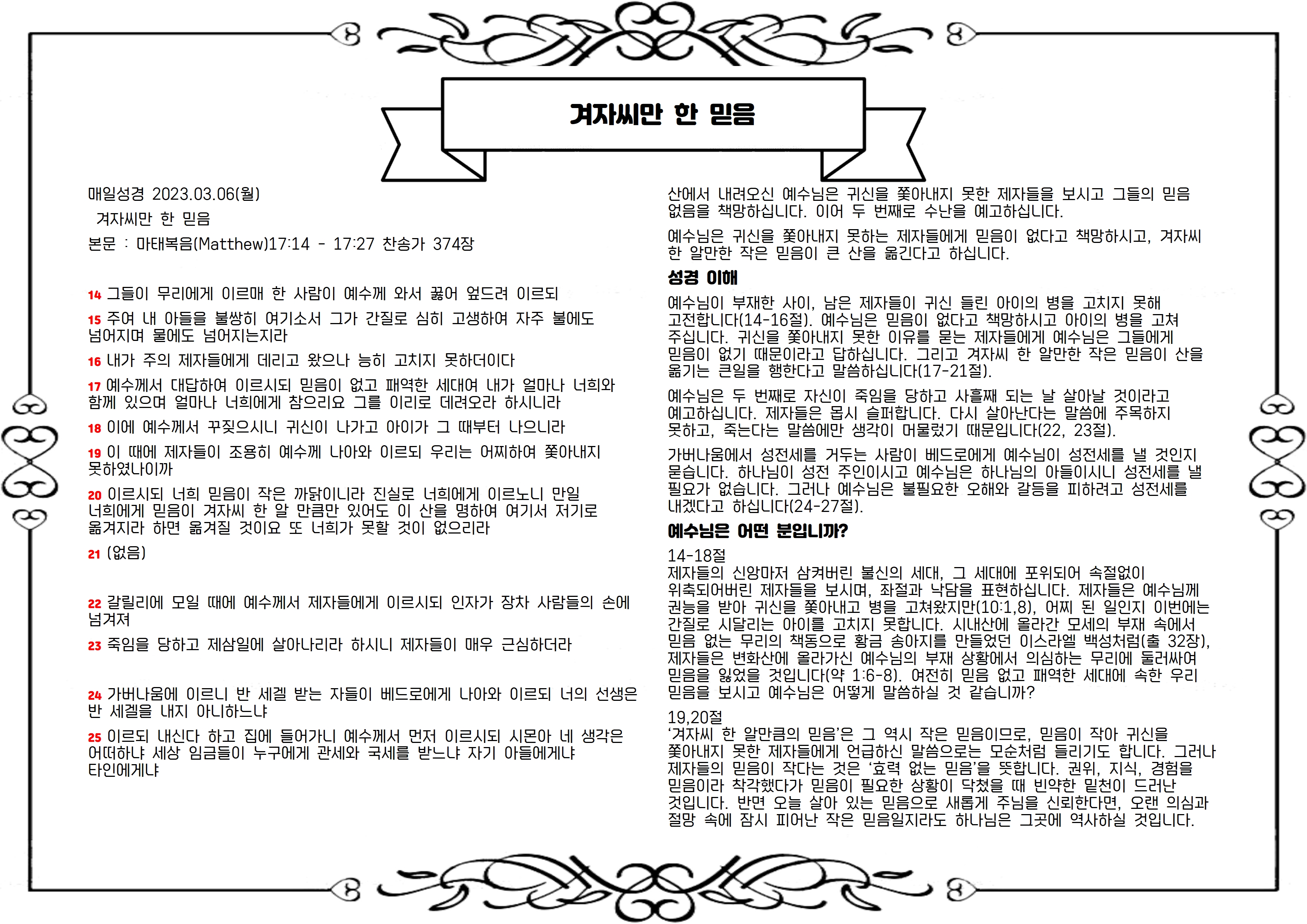 본문 : 마태복음(Matthew)17:14 - 17:27 찬송가 374장