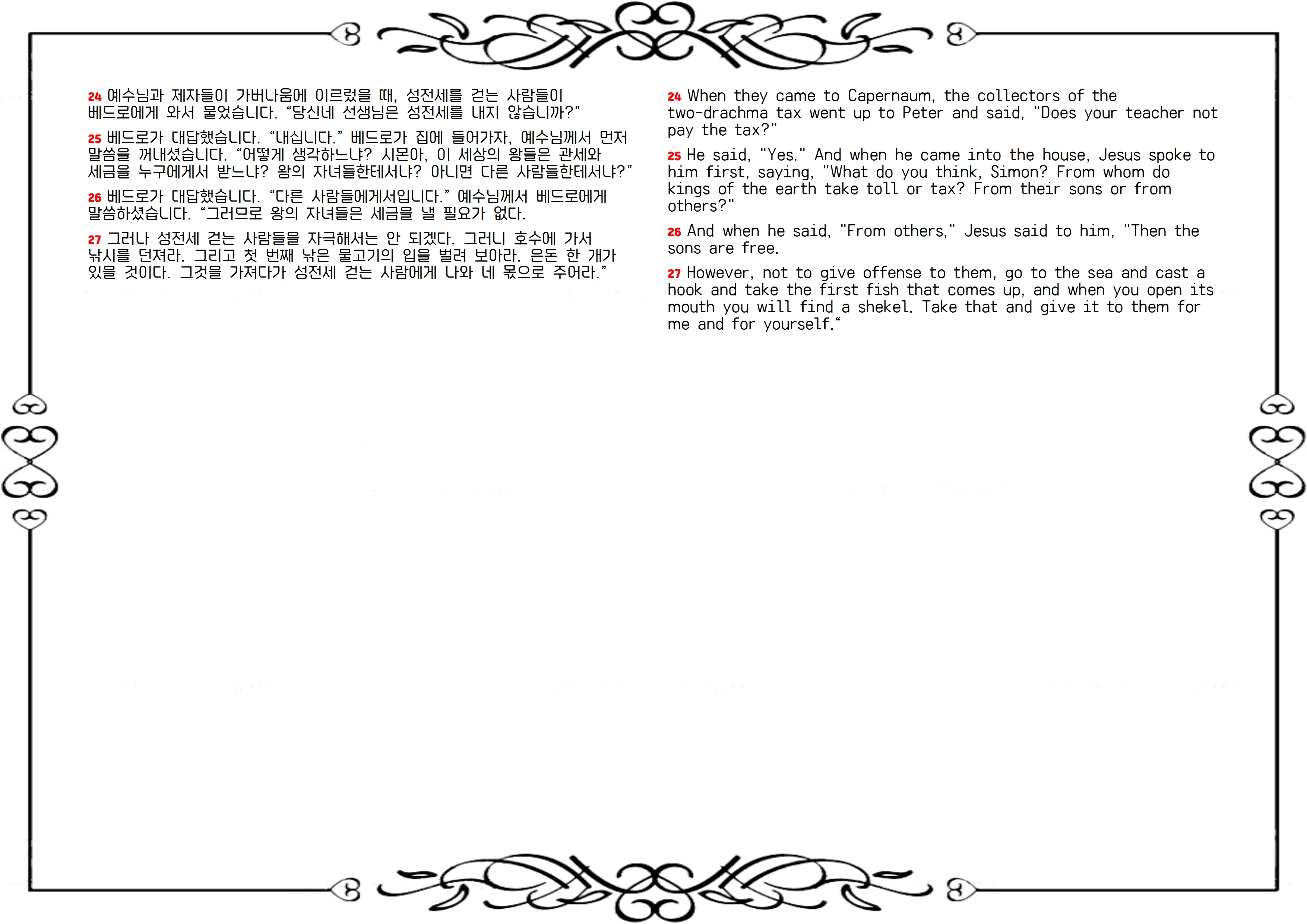 24 가버나움에 이르니 반 세겔 받는 자들이 베드로에게 나아와 이르되 너의 선생은 반 세겔을 내지 아니하느냐