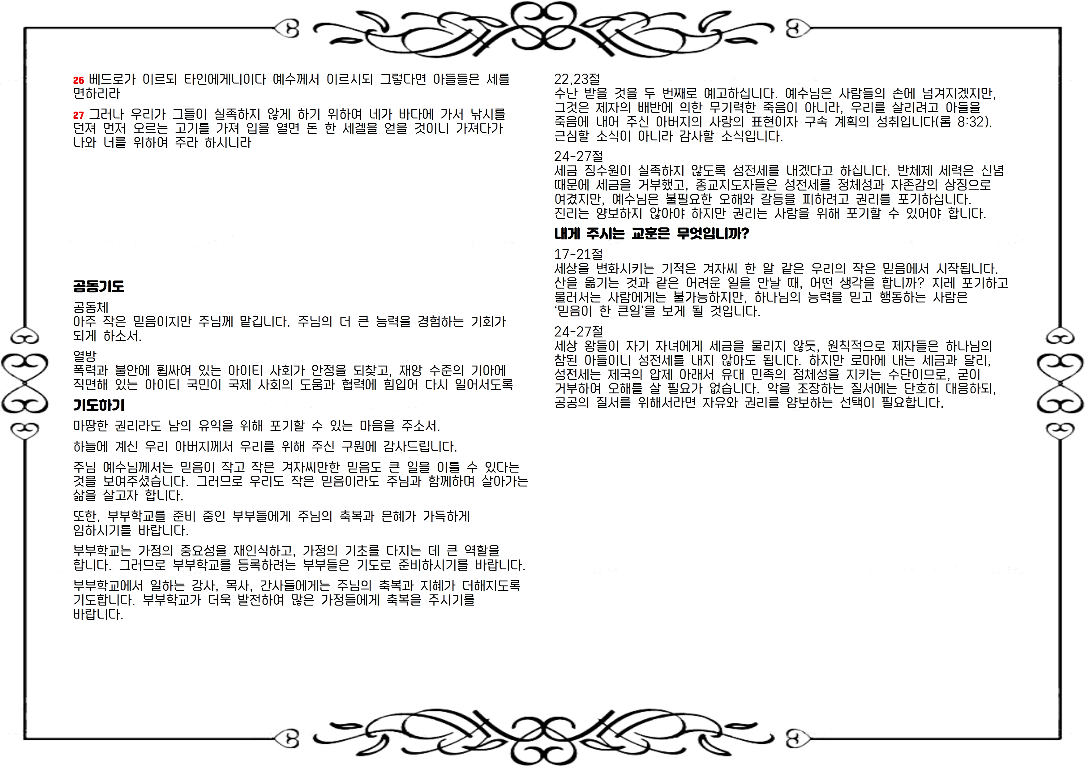 세금 징수원이 실족하지 않도록 성전세를 내겠다고 하십니다. 반체제 세력은 신념 때문에 세금을 거부했고, 종교지도자들은 성전세를 정체성과 자존감의 상징으로 여겼지만, 예수님은 불필요한 오해와 갈등을 피하려고 권리를 포기하십니다. 진리는 양보하지 않아야 하지만 권리는 사랑을 위해 포기할 수 있어야 합니다.
