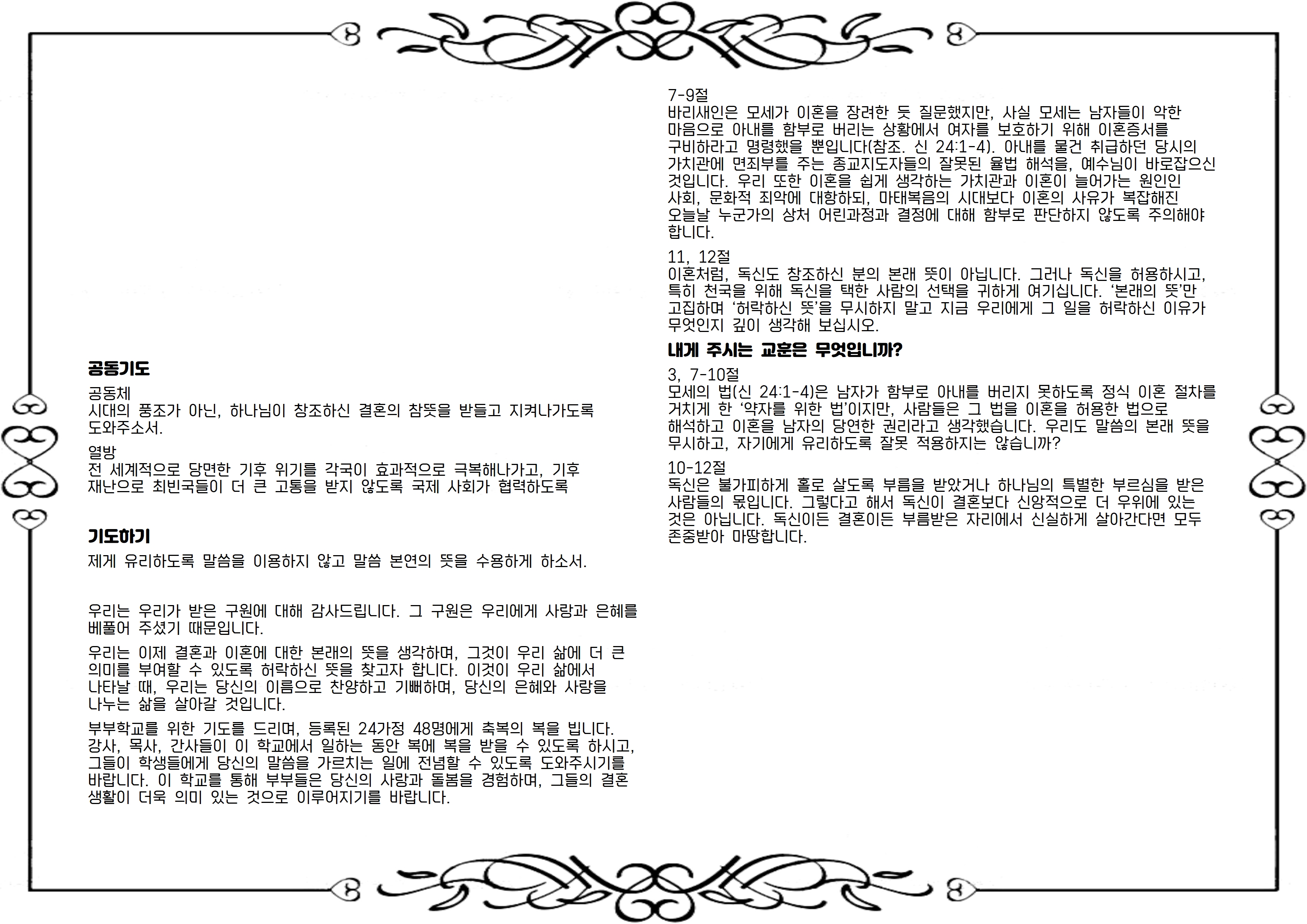 우리는 이제 결혼과 이혼에 대한 본래의 뜻을 생각하며, 그것이 우리 삶에 더 큰 의미를 부여할 수 있도록 허락하신 뜻을 찾고자 합니다. 이것이 우리 삶에서 나타날 때, 우리는 당신의 이름으로 찬양하고 기뻐하며, 당신의 은혜와 사랑을 나누는 삶을 살아갈 것입니다.