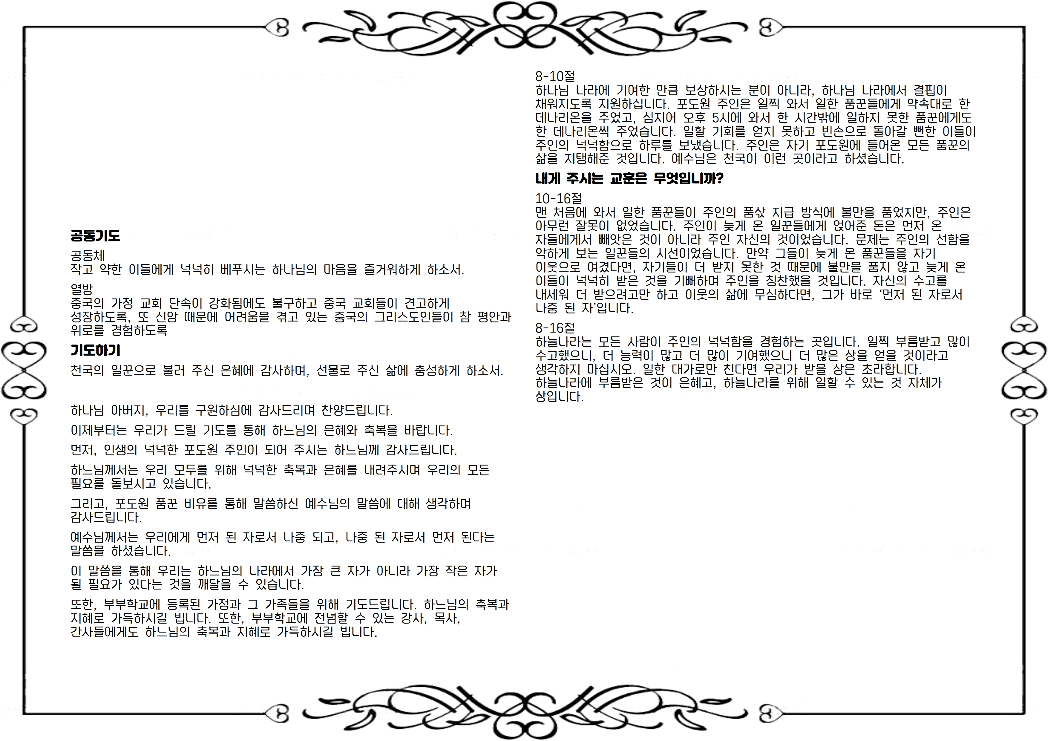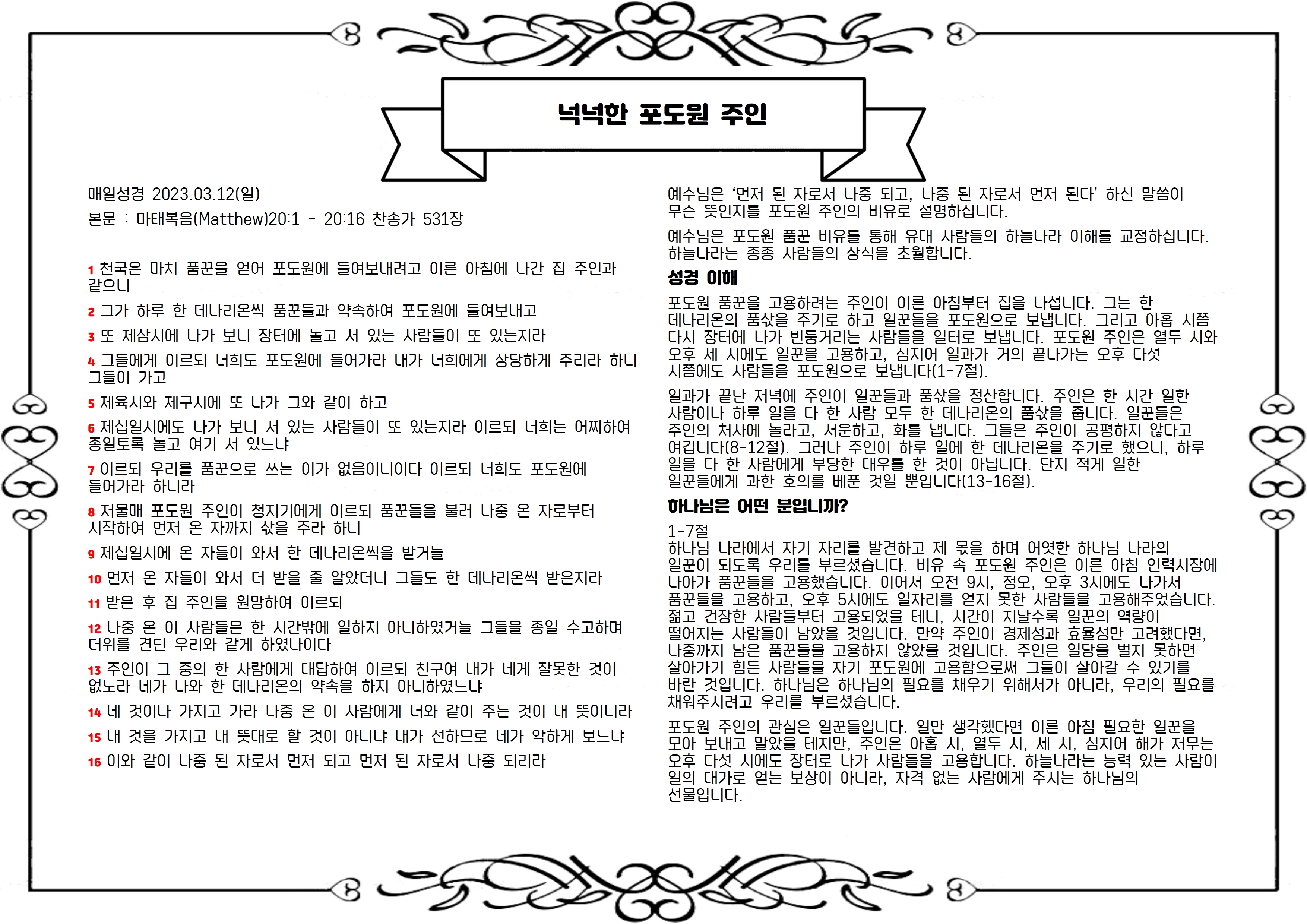 그리고, 포도원 품꾼 비유를 통해 말씀하신 예수님의 말씀에 대해 생각하며 감사드립니다.