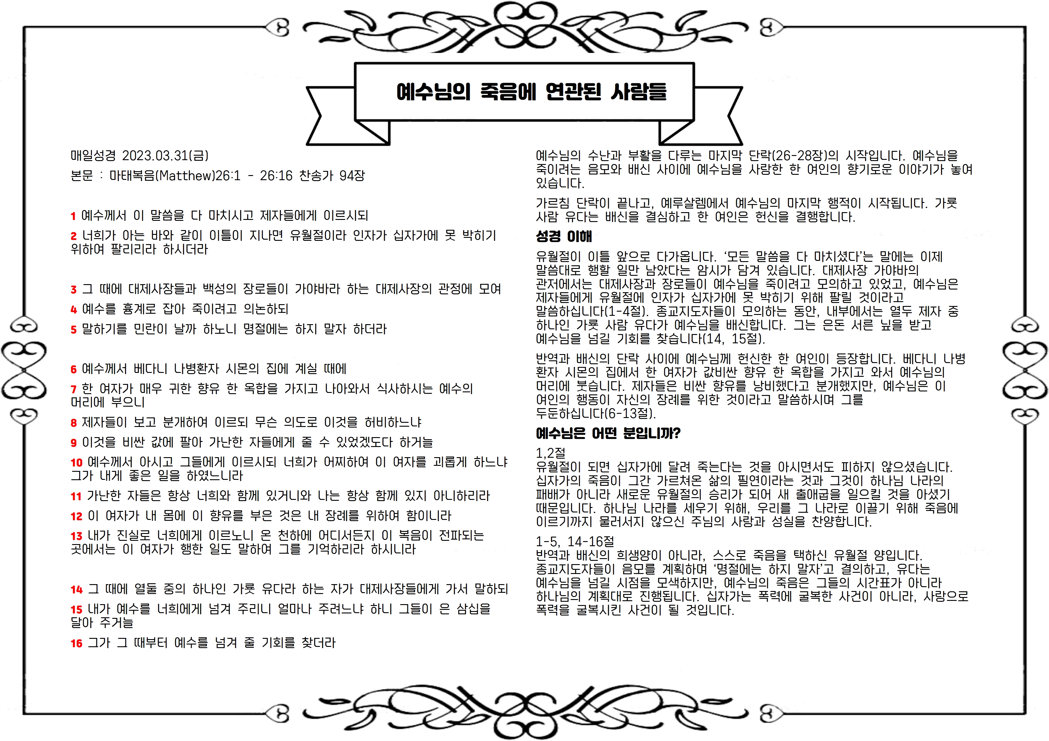 본문 : 마태복음(Matthew)26:1 - 26:16 찬송가 94장