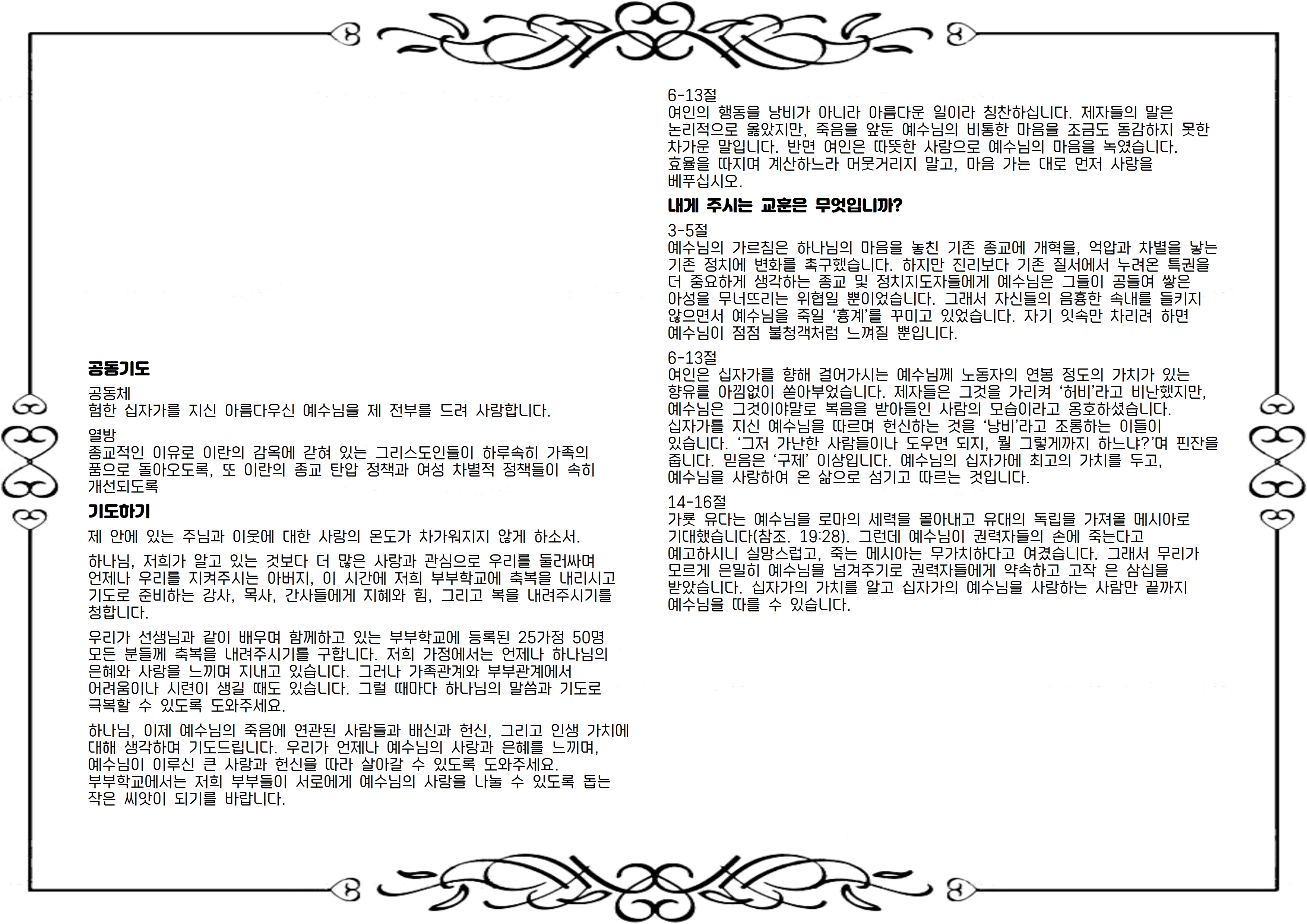 여인은 십자가를 향해 걸어가시는 예수님께 노동자의 연봉 정도의 가치가 있는 향유를 아낌없이 쏟아부었습니다. 제자들은 그것을 가리켜 ‘허비’라고 비난했지만, 예수님은 그것이야말로 복음을 받아들인 사람의 모습이라고 옹호하셨습니다. 십자가를 지신 예수님을 따르며 헌신하는 것을 ‘낭비’라고 조롱하는 이들이 있습니다. ‘그저 가난한 사람들이나 도우면 되지, 뭘 그렇게까지 하느냐?’며 핀잔을 줍니다. 믿음은 ‘구제’ 이상입니다. 예수님의 십자가에 최고의 가치를 두고, 예수님을 사랑하여 온 삶으로 섬기고 따르는 것입니다.