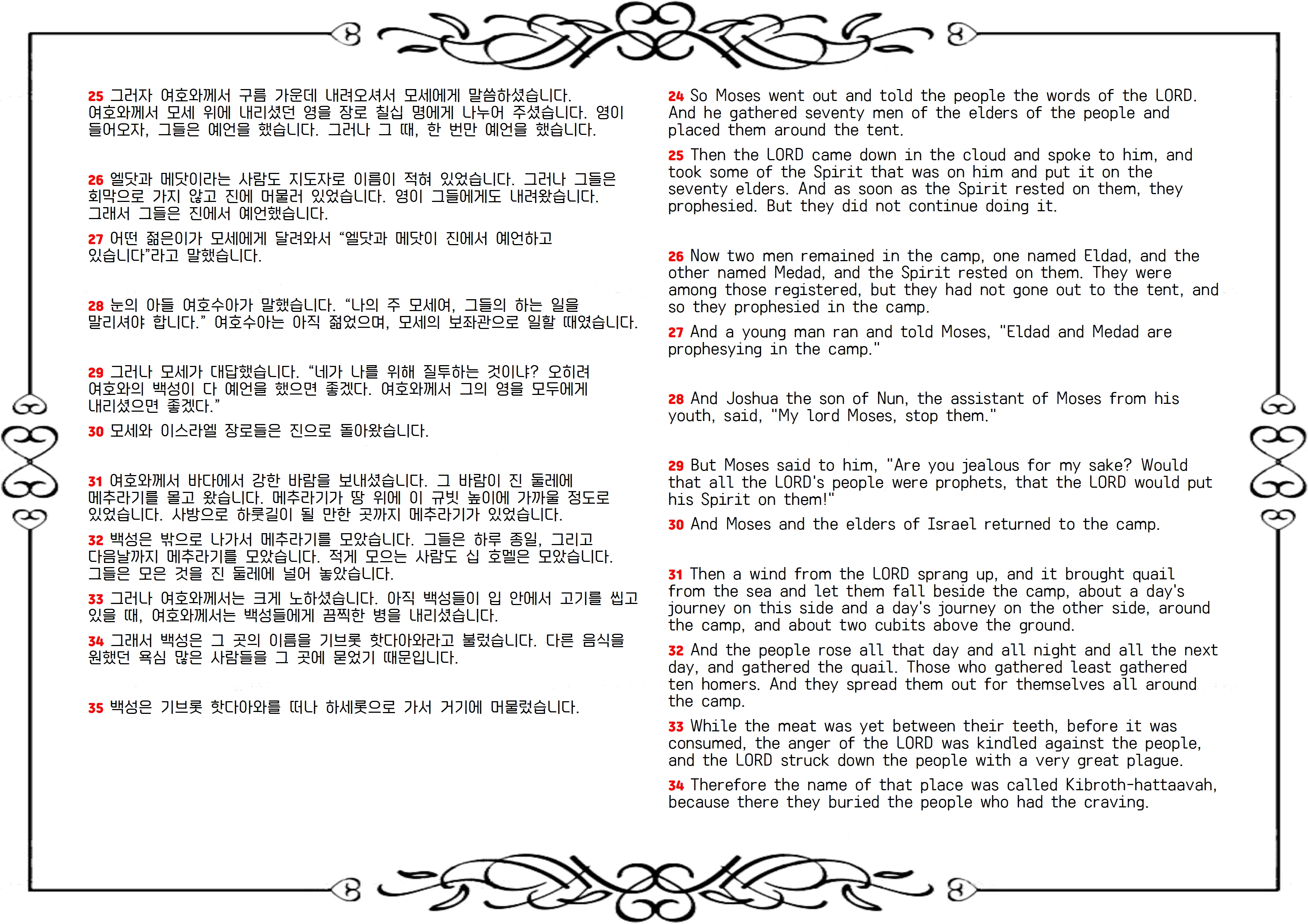 백성의 장로들 70명에게 모세에게 내린 영을 내리고, 진 안에 머물던 엘닷과 메닷도 영을 받고 예언합니다(24-30절). 이 일을 두고 여호수아가 항의하지만, 모세는 모든 사람에게 영이 내리기를 바란다고 답합니다. 이어서 주님은 바람을 일으켜 메추라기를 보내십니다. 백성이 밤새 메추라기를 모았는데 적게 모은 사람도 열 호멜(약 2천 리터)을 거둡니다. 그들이 탐욕스럽게 고기를 먹는 동안 주님이 재앙을 내리십니다. 사람들은 그곳 이름을 ‘기브롯 핫다아와’(탐욕의 무덤들)라고 부릅니다(31-35절).