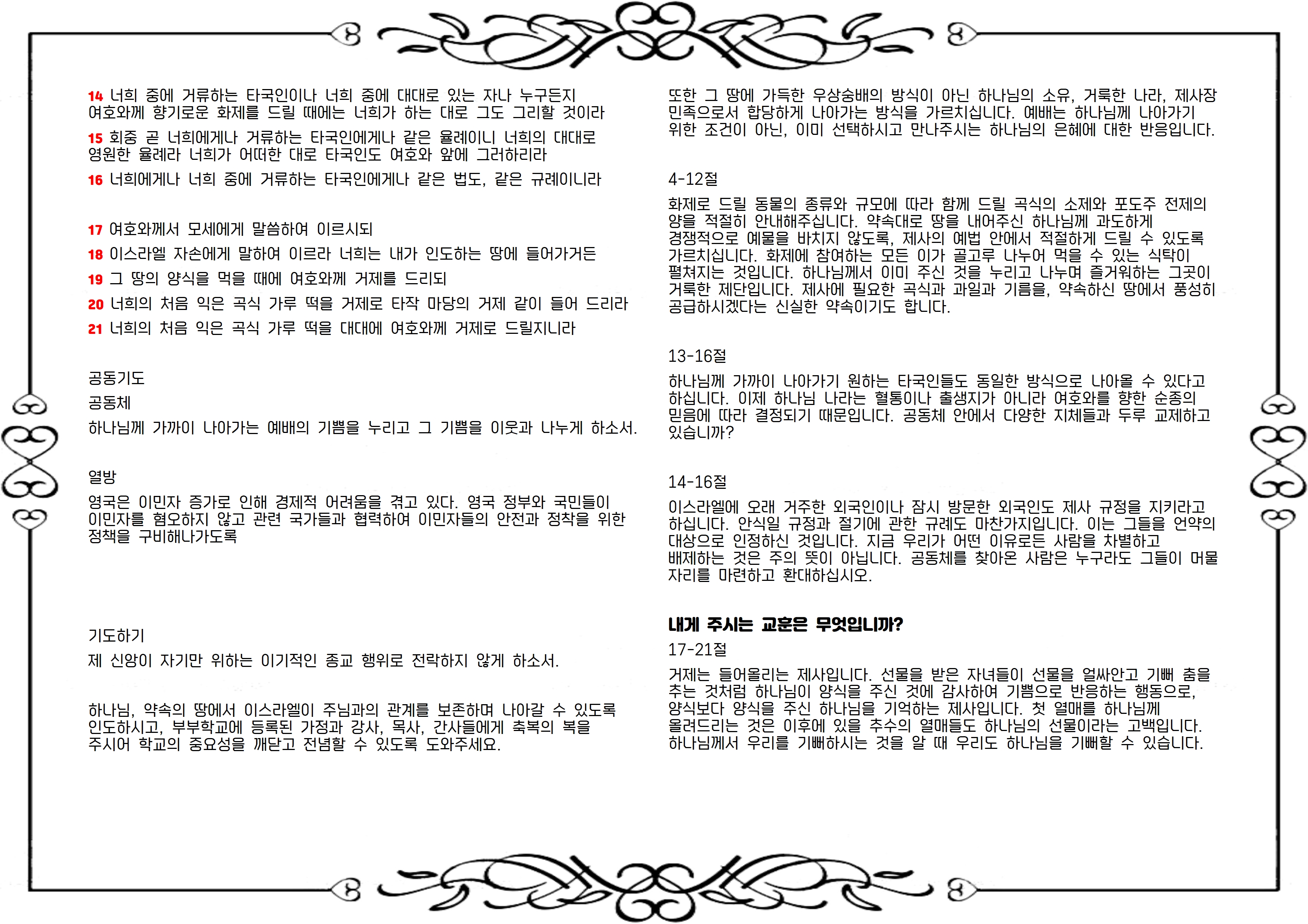 이스라엘에 오래 거주한 외국인이나 잠시 방문한 외국인도 제사 규정을 지키라고 하십니다. 안식일 규정과 절기에 관한 규례도 마찬가지입니다. 이는 그들을 언약의 대상으로 인정하신 것입니다. 지금 우리가 어떤 이유로든 사람을 차별하고 배제하는 것은 주의 뜻이 아닙니다. 공동체를 찾아온 사람은 누구라도 그들이 머물 자리를 마련하고 환대하십시오.