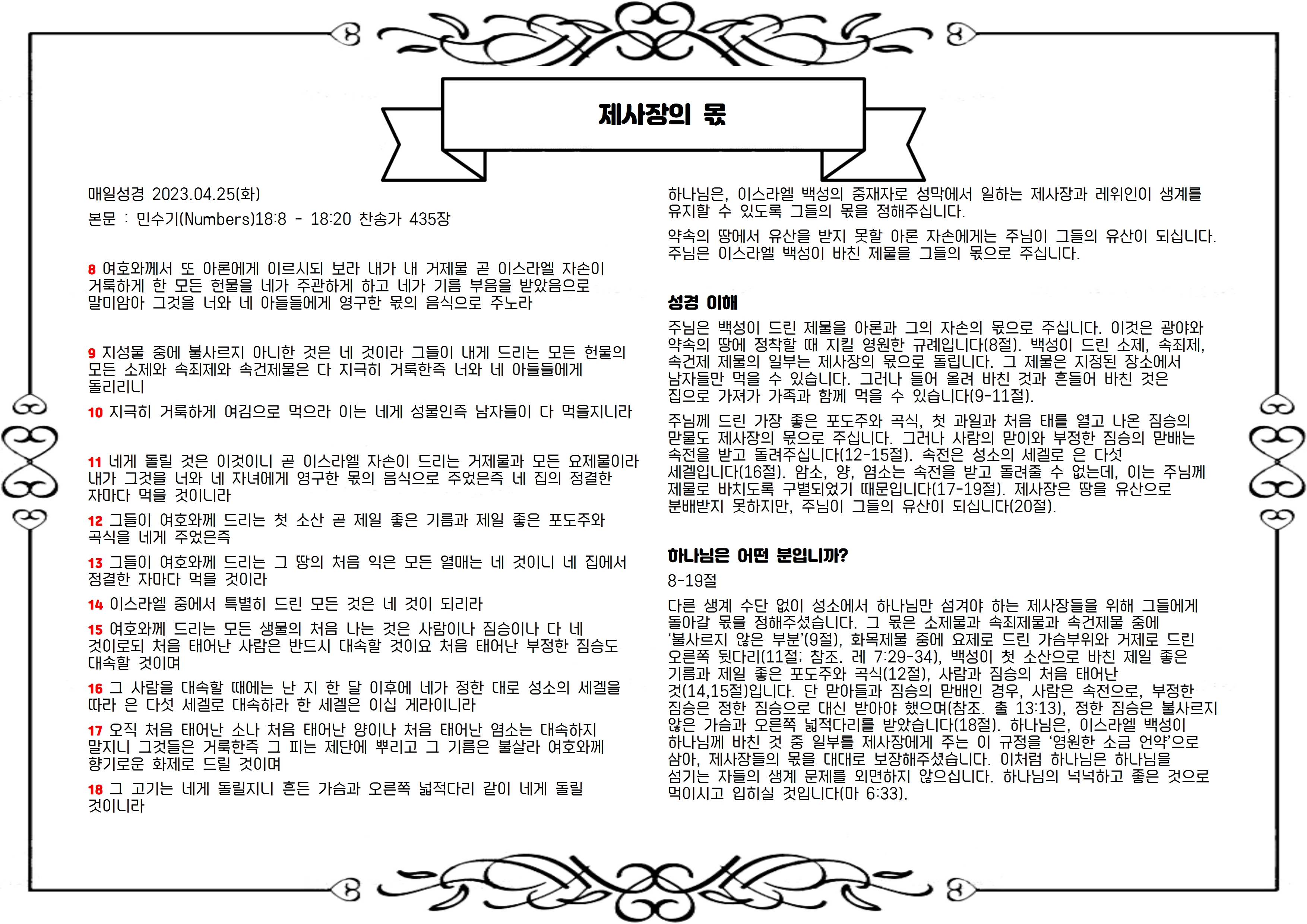 본문 : 민수기(Numbers)18:8 - 18:20 찬송가 435장