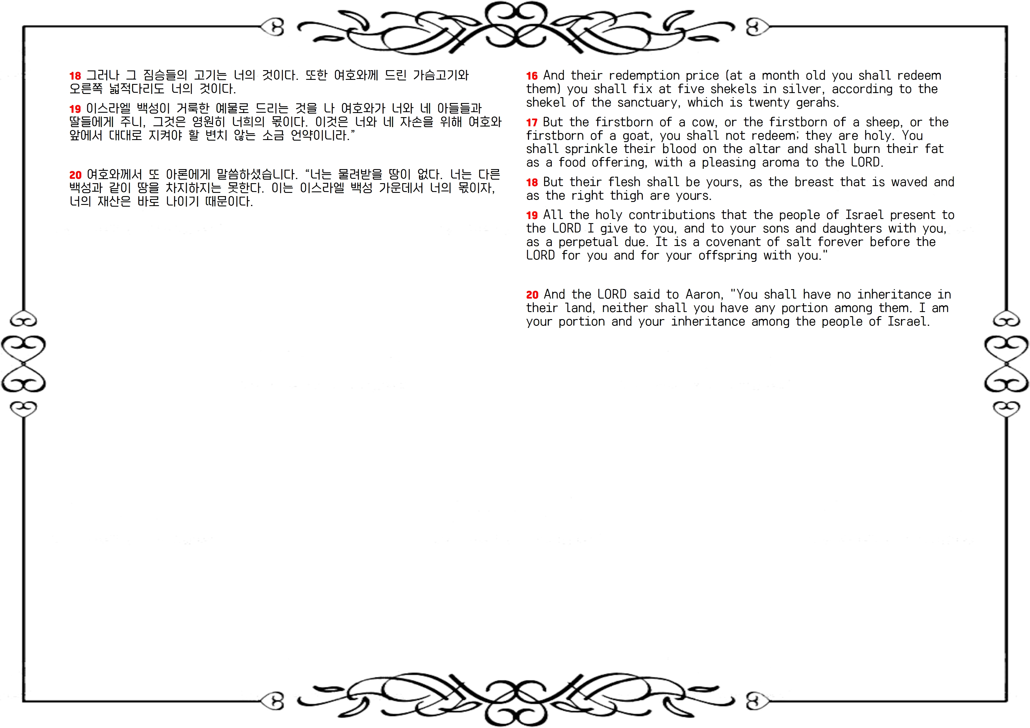 주님께 드린 가장 좋은 포도주와 곡식, 첫 과일과 처음 태를 열고 나온 짐승의 맏물도 제사장의 몫으로 주십니다. 그러나 사람의 맏이와 부정한 짐승의 맏배는 속전을 받고 돌려주십니다(12-15절). 속전은 성소의 세겔로 은 다섯 세겔입니다(16절). 암소, 양, 염소는 속전을 받고 돌려줄 수 없는데, 이는 주님께 제물로 바치도록 구별되었기 때문입니다(17-19절). 제사장은 땅을 유산으로 분배받지 못하지만, 주님이 그들의 유산이 되십니다(20절).