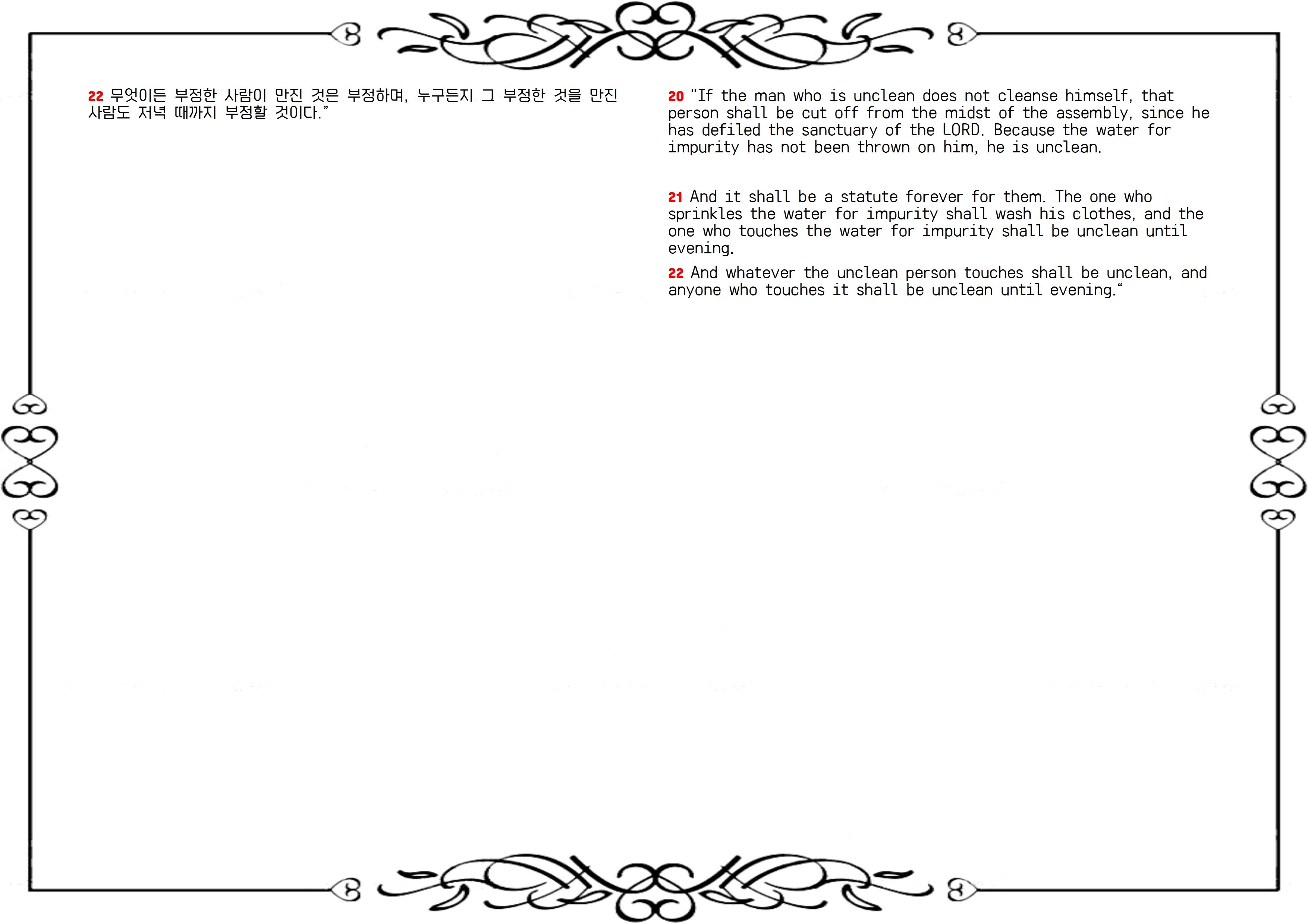 주검과 접촉하여 부정하게 되는 경우와 부정을 씻는 규정입니다. 주검이 몸에 닿은 사람은 7일간 부정합니다. 그는 3일째와 7일째에 붉은 암송아지의 재를 탄 물로 씻어야 정하게 됩니다. 정결 의식을 행하지 않는 사람은 부정이 그대로 있고, 성막을 더럽히는 사람이기에 이스라엘에서 추방됩니다(11-13, 20절).