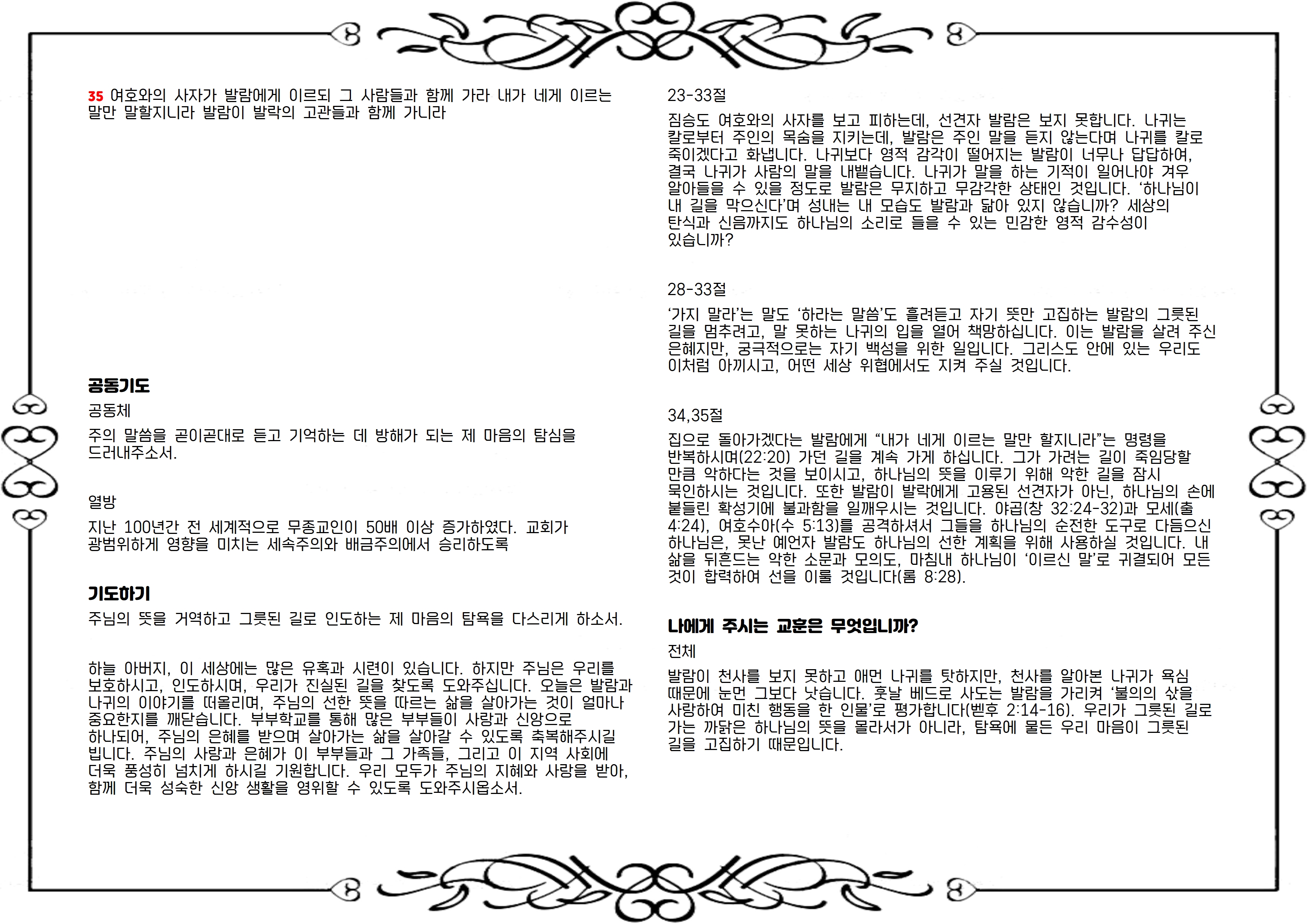 ‘가지 말라’는 말도 ‘하라는 말씀’도 흘려듣고 자기 뜻만 고집하는 발람의 그릇된 길을 멈추려고, 말 못하는 나귀의 입을 열어 책망하십니다. 이는 발람을 살려 주신 은혜지만, 궁극적으로는 자기 백성을 위한 일입니다. 그리스도 안에 있는 우리도 이처럼 아끼시고, 어떤 세상 위협에서도 지켜 주실 것입니다.