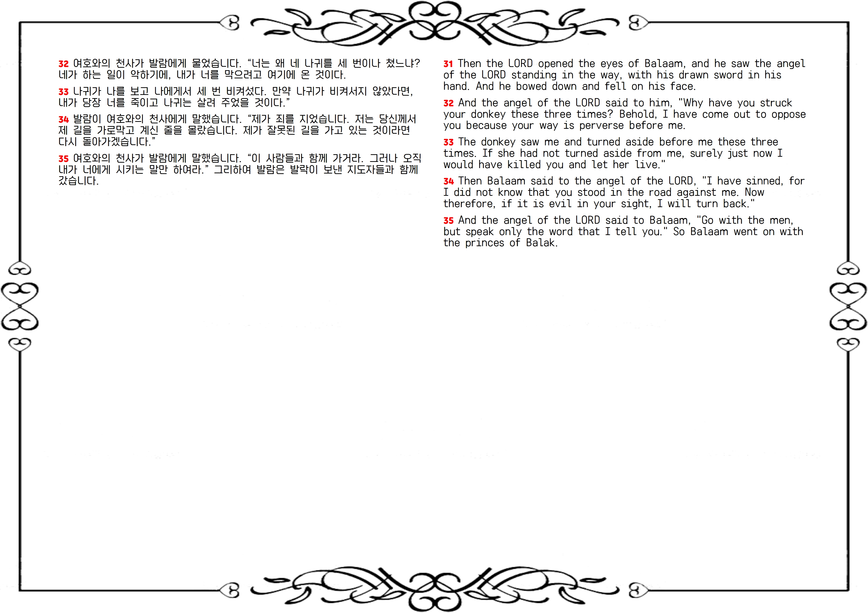 칼을 든 천사가 길을 막아서자, 나귀가 그를 보고 밭으로 피하고, 벽에 몸을 긁고, 나중에는 길에 주저앉아 버립니다. 그때마다 발람이 나귀를 때리며 길을 재촉했습니다(23-27절). 그때 주님이 나귀의 입을 열어 발람과 논쟁하게 하시고, 발람의 눈을 열어 길을 막아선 천사를 보게 하십니다. 천사는 그가 가서는 안 될 길을 가고 있고 나귀가 아니었다면 벌써 그를 죽였을 것이라고 말합니다(28-33절). 이에 발람이 돌아가겠다고 하지만, 천사는 가서 하나님의 뜻을 전하라고 합니다(34, 35절). 하나님은 발람의 욕심을 거꾸로 사용하여, 그의 입으로 이스라엘을 축복하게 하실 것입니다.