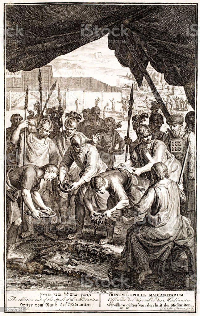 이스라엘 백성은 전리품을 함께 나누며 승리의 기쁨을 누립니다. 한편 지휘관들은 아군의 희생자가 한 사람도 없음을 알고 하나님께 예물을 드립니다.
