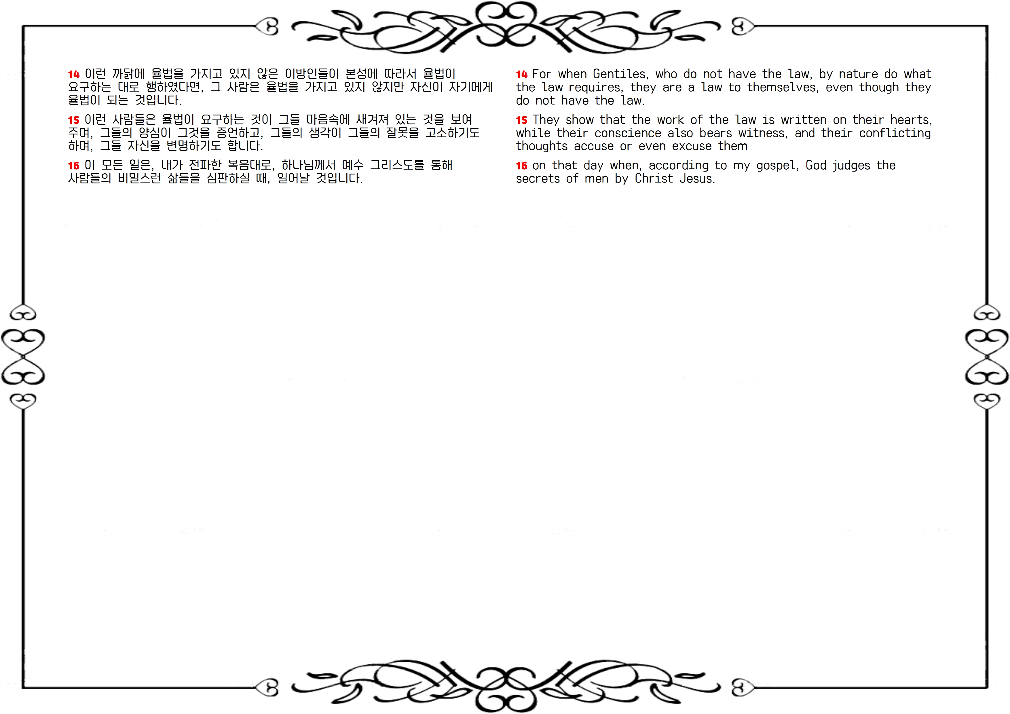 하나님은 각 사람이 행한 대로 갚아 주십니다(6-11절). 이방 출신이라고 차별하지 않으시고, 선민이라고 봐주지도 않으십니다. 율법이 있으면 율법대로, 율법이 없으면 그들 본성에 새긴 양심을 따라 그들의 행위를 판단하실 것입니다(12-16절).