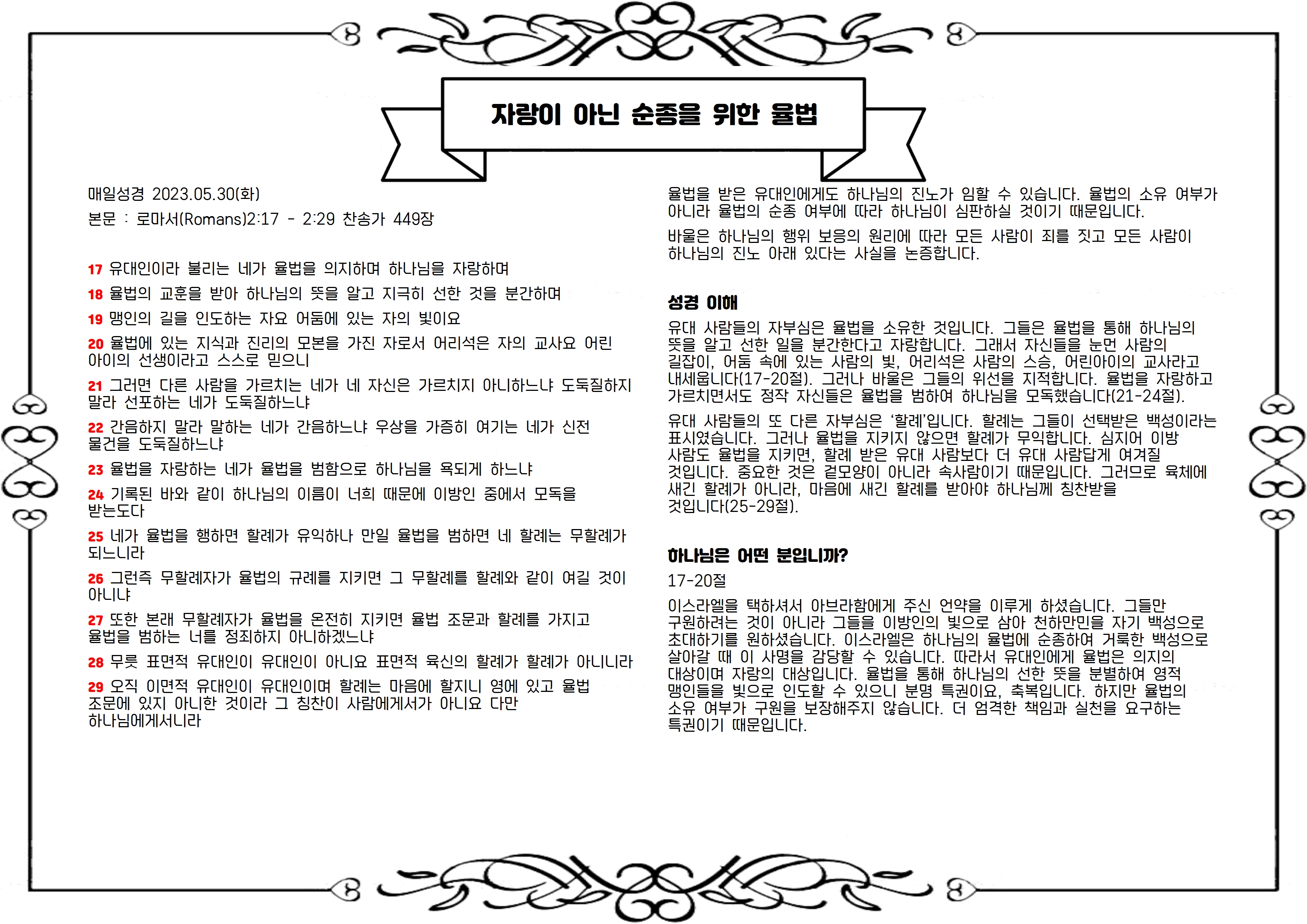 유대 사람들은 율법을 자랑하면서도 율법을 지키지 않았고, 하나님 백성이라는 자부심이 있었으나 하나님을 욕되게 했습니다. 바울은 소유가 아니라 순종이, 겉모양이 아니라 속마음이 중요하다고 역설합니다. 바울의 책망은 그리스도인들이 귀담아들을 말씀입니다. 말씀의 사람, 하나님의 자녀라는 확신과 자랑도 그에 걸맞은 행위가 없으면 무익합니다.