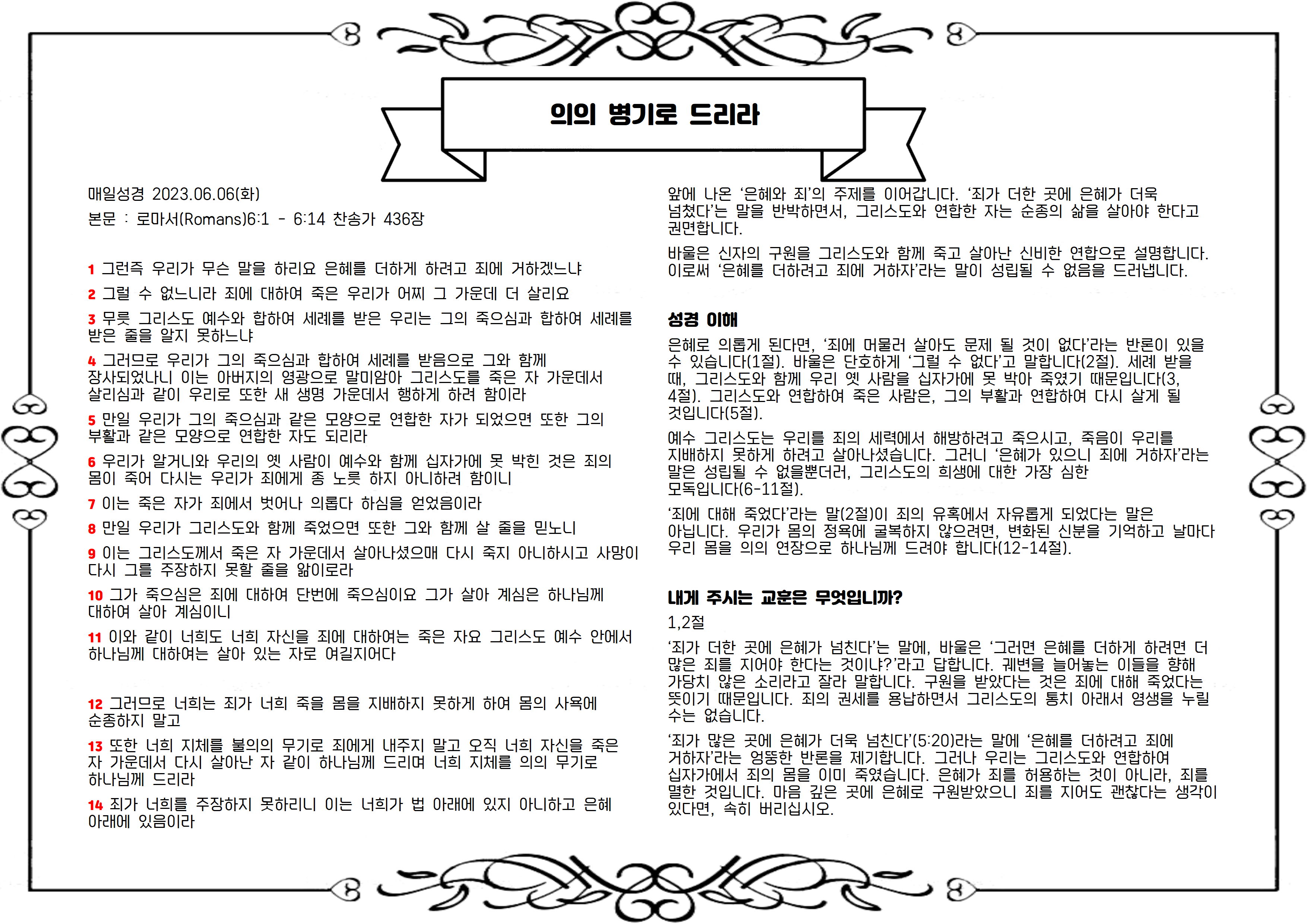 은혜로 의롭게 된다면, ‘죄에 머물러 살아도 문제 될 것이 없다’라는 반론이 있을 수 있습니다(1절). 바울은 단호하게 ‘그럴 수 없다’고 말합니다(2절). 세례 받을 때, 그리스도와 함께 우리 옛 사람을 십자가에 못 박아 죽였기 때문입니다(3, 4절). 그리스도와 연합하여 죽은 사람은, 그의 부활과 연합하여 다시 살게 될 것입니다(5절).