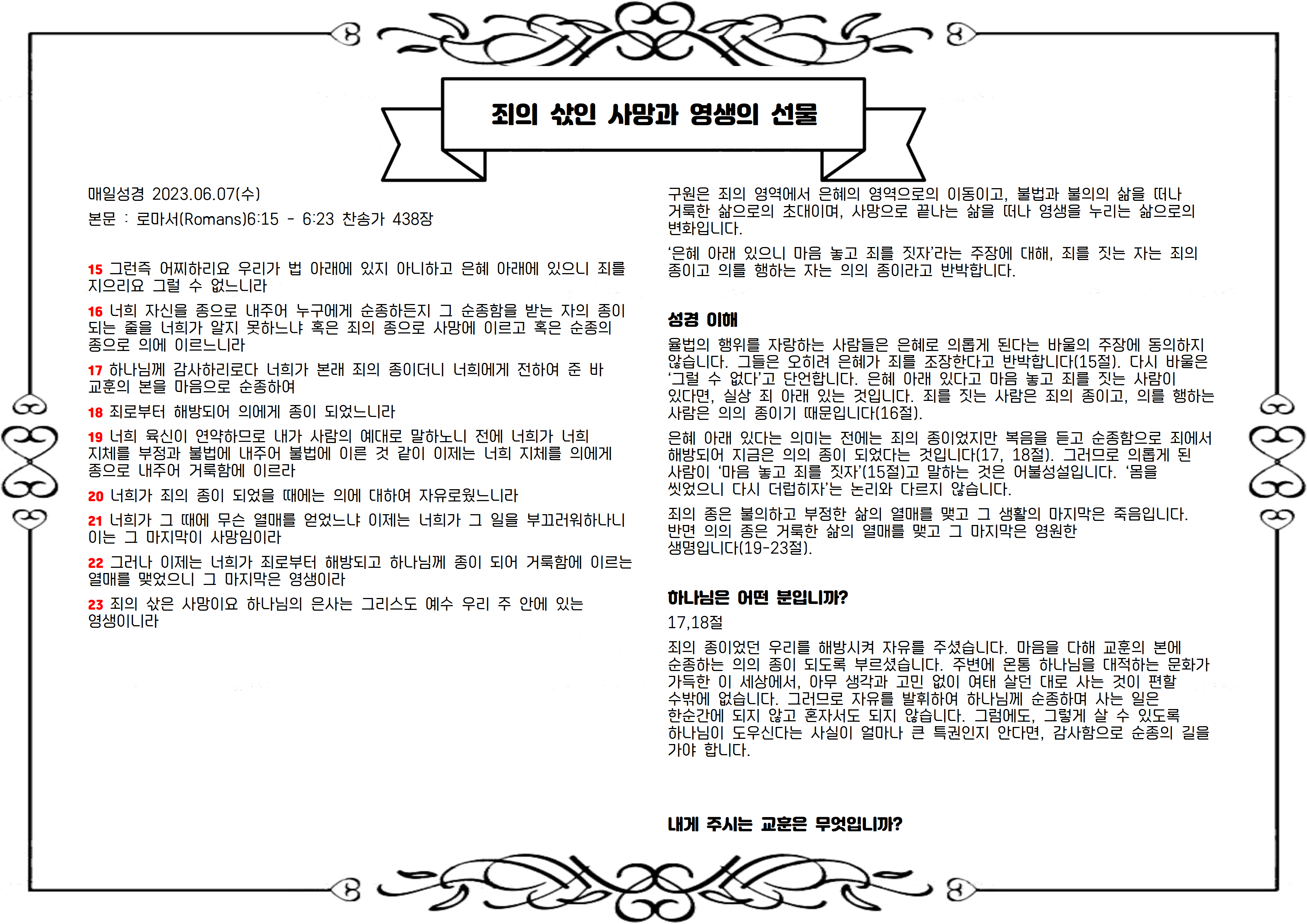 본문 : 로마서(Romans)6:15 - 6:23 찬송가 438장