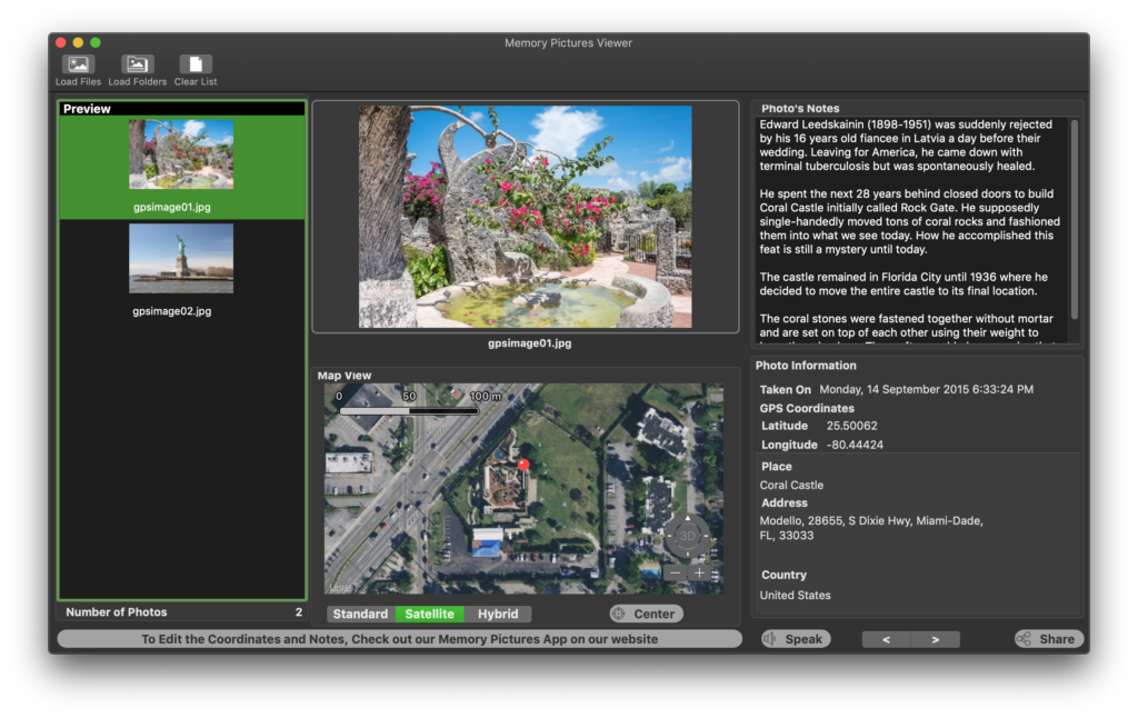 이 뷰어는 무료로 배포되며 JPEG 사진과 함께 사용할 수 있지만, 특히 메모리 픽스 응용 프로그램에 내장된 GPS 및 노트가 포함된 뷰어에 가장 적합합니다. 현재 메모리 사진은 Mac 앱 스토어에서 Mac 응용 프로그램으로 사용할 수 있습니다. Mac 플랫폼의 Mapkit은 이러한 개발에 상당히 큰 도움이 됩니다.