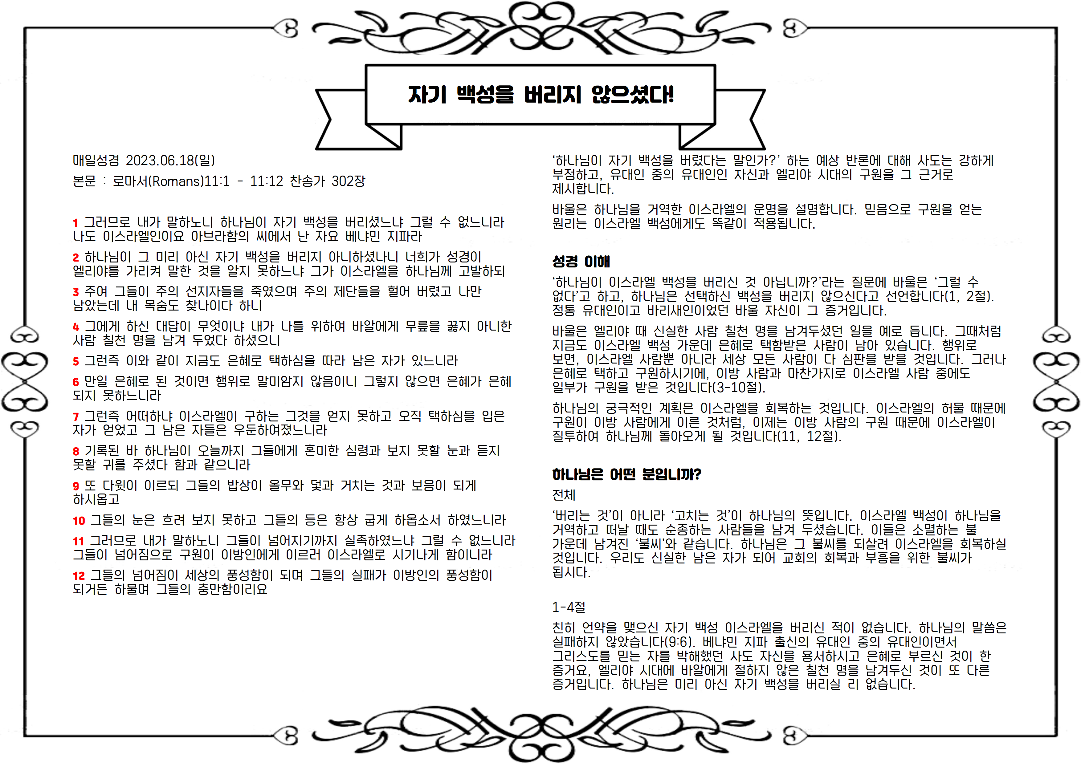 친히 언약을 맺으신 자기 백성 이스라엘을 버리신 적이 없습니다. 하나님의 말씀은 실패하지 않았습니다(9:6). 베냐민 지파 출신의 유대인 중의 유대인이면서 그리스도를 믿는 자를 박해했던 사도 자신을 용서하시고 은혜로 부르신 것이 한 증거요, 엘리야 시대에 바알에게 절하지 않은 칠천 명을 남겨두신 것이 또 다른 증거입니다. 하나님은 미리 아신 자기 백성을 버리실 리 없습니다.