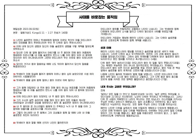 예언자 나단은 다윗을 설득하기 위해 치밀하게 계획하고 단호하게 행동합니다. 나단은 전에 밧세바의 일로 다윗을 책망했는데, 이번에는 아도니야의 일로 다윗을 찾아가 그의 의식을 깨웁니다. 옳은 일을 마음으로만 지지하지 말고, 그 일이 이루어지도록 구체적으로 행동하십시오.