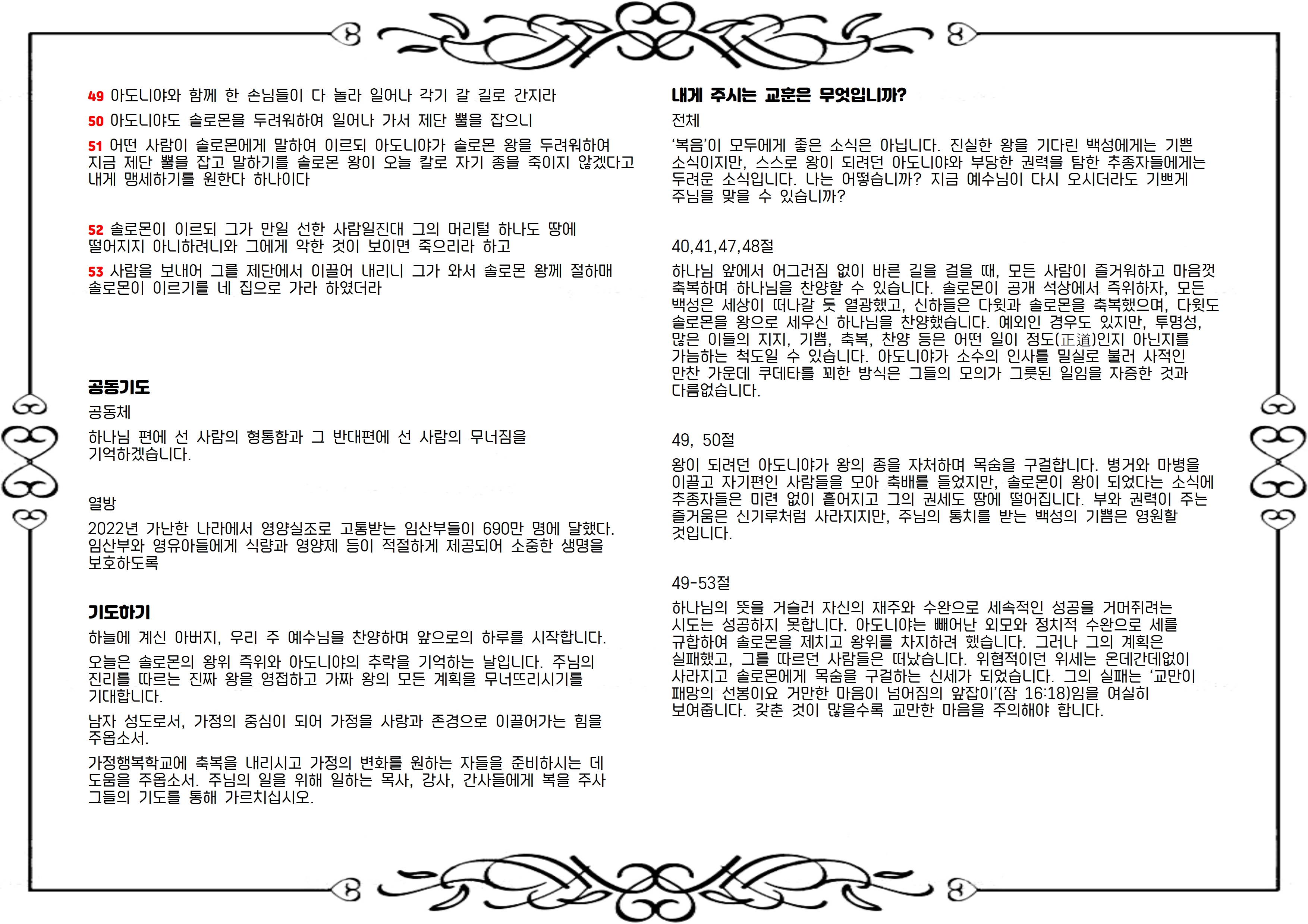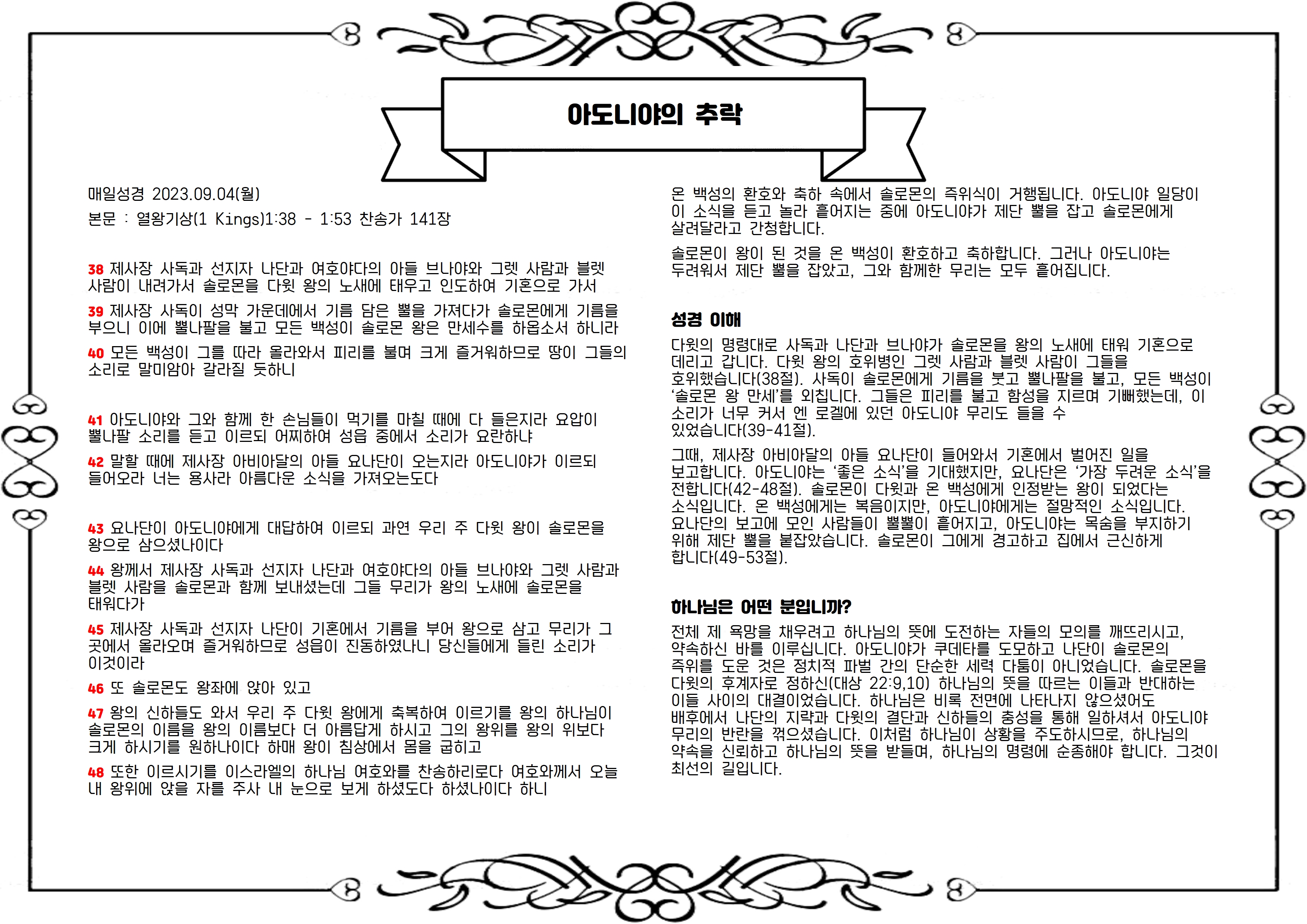 전체 제 욕망을 채우려고 하나님의 뜻에 도전하는 자들의 모의를 깨뜨리시고, 약속하신 바를 이루십니다. 아도니야가 쿠데타를 도모하고 나단이 솔로몬의 즉위를 도운 것은 정치적 파벌 간의 단순한 세력 다툼이 아니었습니다. 솔로몬을 다윗의 후계자로 정하신(대상 22:9,10) 하나님의 뜻을 따르는 이들과 반대하는 이들 사이의 대결이었습니다. 하나님은 비록 전면에 나타나지 않으셨어도 배후에서 나단의 지략과 다윗의 결단과 신하들의 충성을 통해 일하셔서 아도니야 무리의 반란을 꺾으셨습니다. 이처럼 하나님이 상황을 주도하시므로, 하나님의 약속을 신뢰하고 하나님의 뜻을 받들며, 하나님의 명령에 순종해야 합니다. 그것이 최선의 길입니다.
